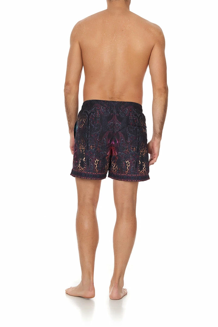 Dive into seductive style with the Smoking Lounge Elastic Waist Boardshort. Inspired by an after dark retreat lined with rich tapestries, these are a vacation staple. Filled with dark hues and strikes of leopard on swim safe fabric, they feature an elasticated waist with drawstring and toggle so they’re as ideal for lounging as they are swimming.Â