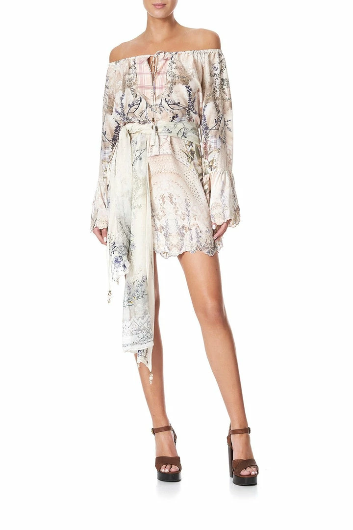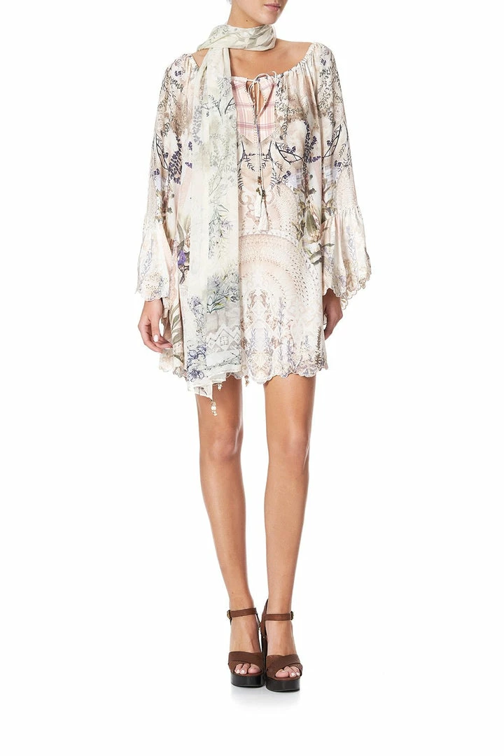 In heartfelt tribute to the relaxed childhood holidays that Camilla spent at her grandmother’s Moree home, the Memories of Moree A-Line Dress with Ruffle Sleeve is happily nostalgic. This cold shoulder dress features delicate broderie anglaise, elasticated neckline with ties, digitally printed silk, as well as neckline crystals as detail.