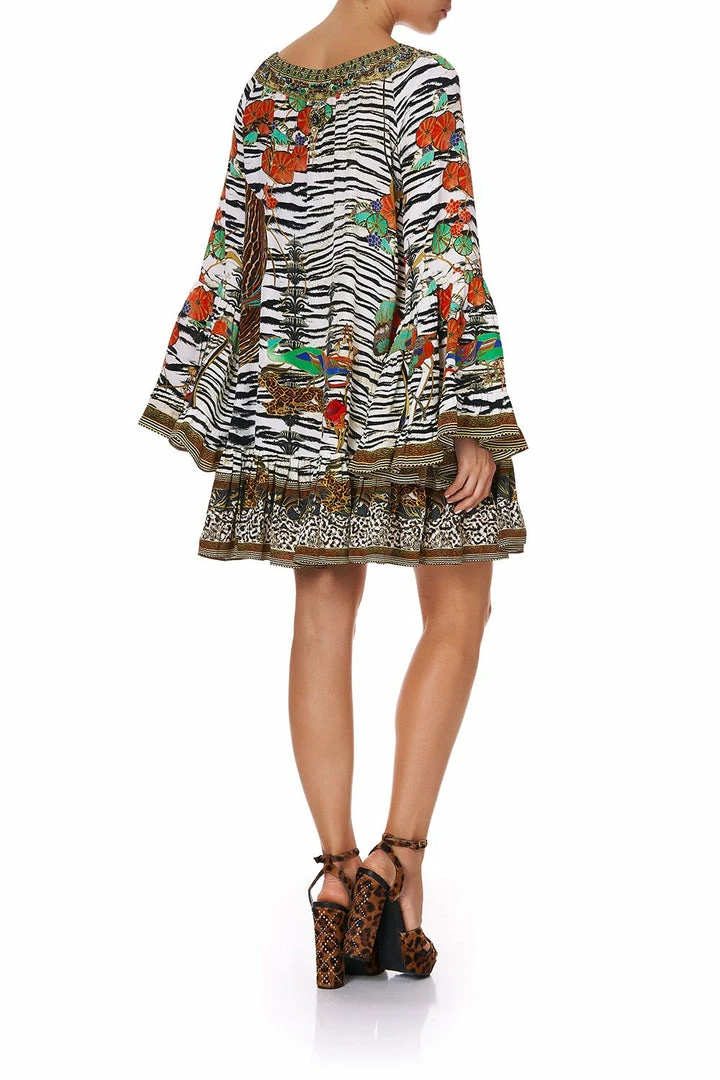 Entranced by a cosmic conflict between Persian folklore against a poetic cream and floral canvas, the Cosmic Conflict A Line Frill Dress is a daring summer statement dress. With leopard hues and floral accents, this silk midi dress features a comfortable elasticated neckline, loose fit, digitally printed silk, floaty boho sleeves, as well as neckline crystals as detail. Wear with sky-rise heels for all night dancing at your next event.