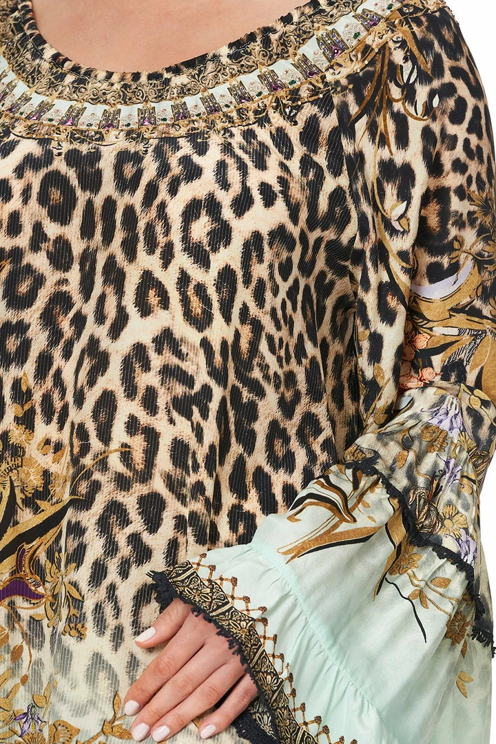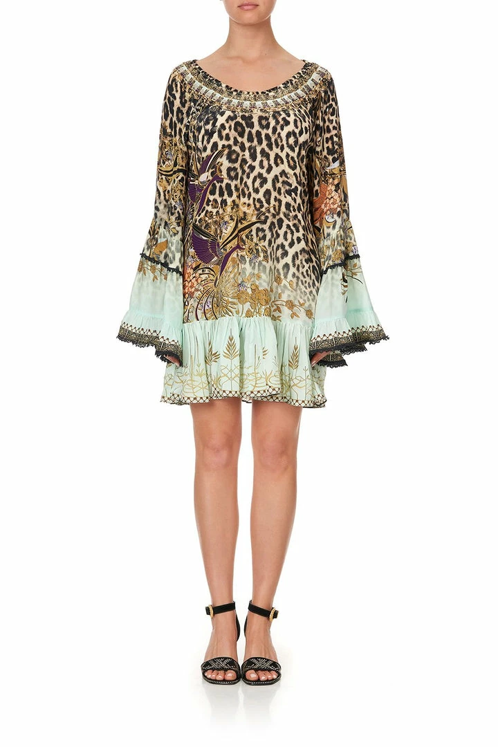 A classic bohemian chic silhouette perfect for springtime festivities, the Nomadic Nymph A-Line Frill Dress glimmers with golden delicate details against a radiant leopard print backdrop. This silk mini dress features a decadent frill bell sleeve, frill layering at the hemline, an elasticated neckline that can be worn both on and off the shoulder and hand placed CAMILLA crystal embellishments. Wear with your favourite heels to dance the night away, belt at the waist for a cinched waist alternative.
