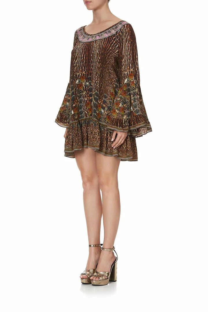 A summer soiree essential that radiates a hypnotic leopard print and hand painted botany, the Wild Azal A Line Frill Dress is a divinely fierce. With a striking golden colour-way referencing Persian folklore, this silk midi dress features a comfortable elasticated neckline, loose fit, digitally printed silk, floaty boho sleeves, as well as neckline crystals as detail. Wear with sky-rise heels for all night dancing at your next event.