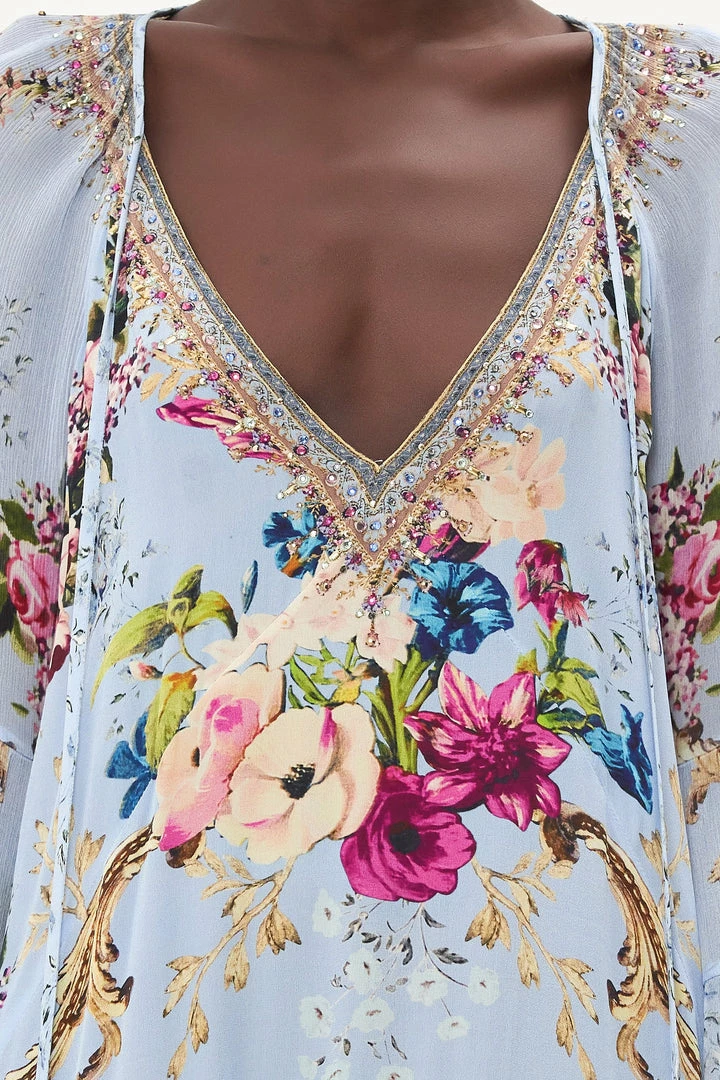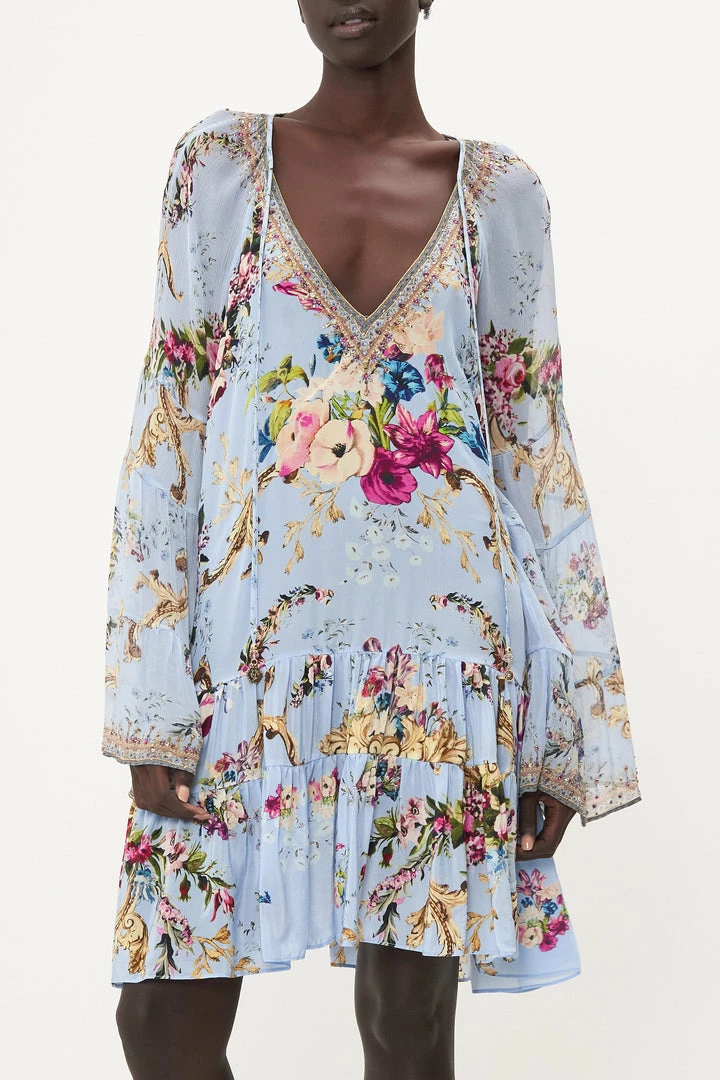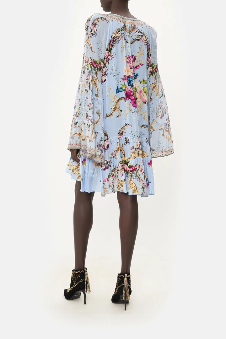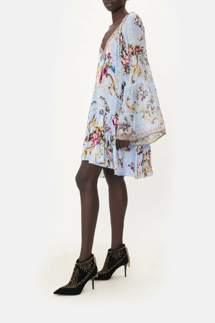 Endlessly poetic and dipped in bohemia, the Floraful A-Line Gathered Panel Dress is immersed in a soft sky blue enveloped in ornate gold detailing and flourishing florals in blush and rose hues. Complete with signature hand-placed CAMILLA crystals, this luxury silk dress features a deep v neckline that wraps at the waistline, a voluminous wide frill sleeve, a relaxed mini silhouette and decadent flare hemline.
