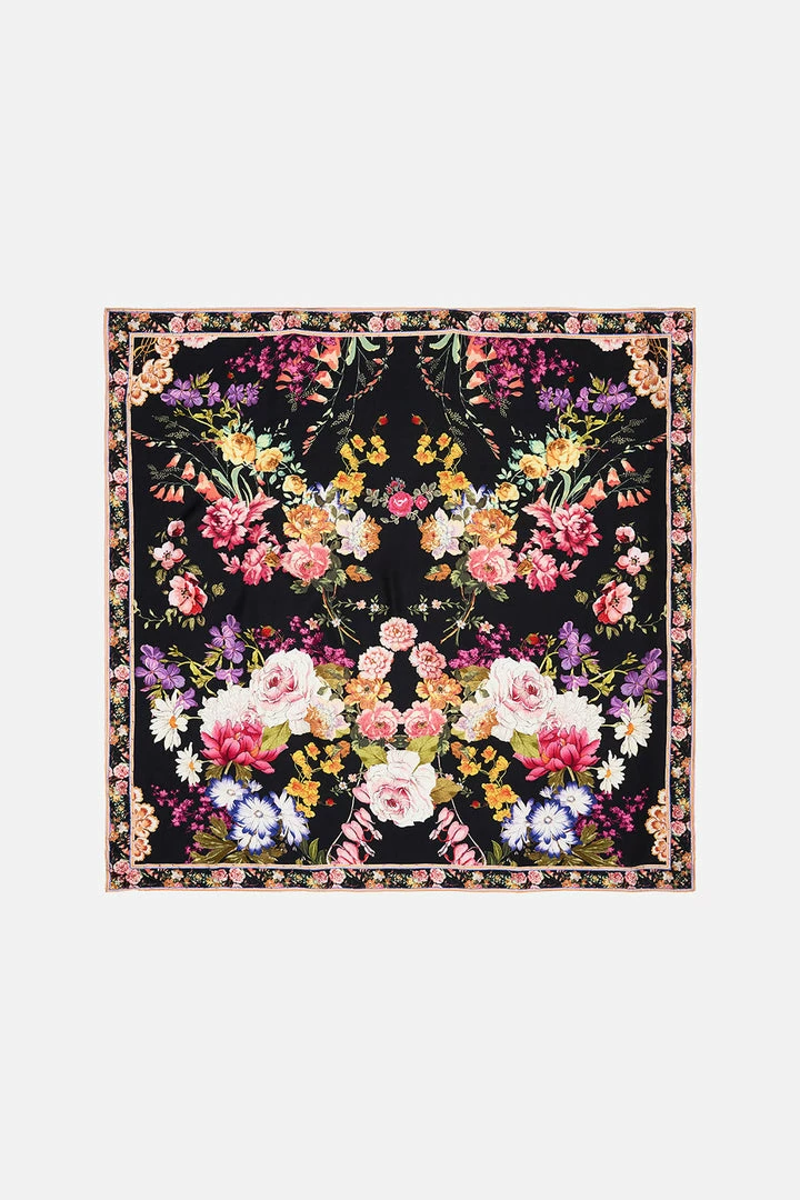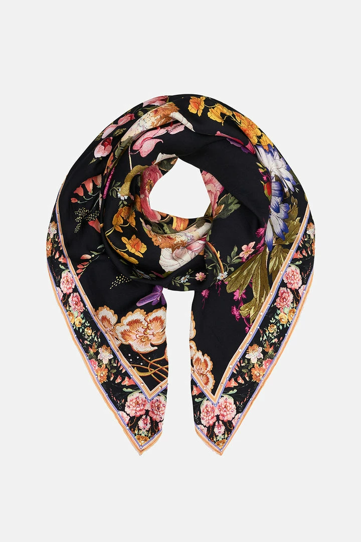 Delicate bohemia blooming amidst a sea of midnight, the Libertine Lady Large Square Scarf captures the gaze with cascades of blush botanicals, florals dipped in canary hues and vines of slated green. Hand-embellished with crystal adornments, this luxury silk scarf features a large expanse, signature CAMILLA shimmer and a multi-wear design. With an array of ways to wear, shift it into a variety of summer tops.