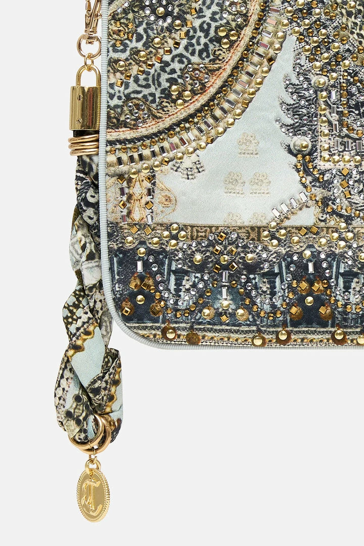 The fingertip accessory reimagined with all that is ornate, our Free Espiritu Scarf Clutch sets the scene with a sea of icy blue hues met with animal print and opulent golden accents. Dipped in hand-embellished crystals, this luxury clutch features a dainty scarf tassel detail with gold hardware, a contrasting soft blue trim, zip fastening and signature CAMILLA adornments. Add flow to your look by matching your jewellery to the gold of the hardware.