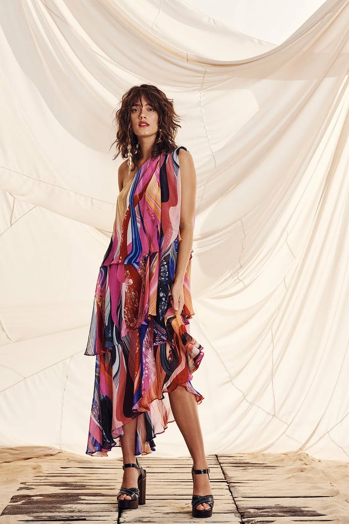 Statement midi dress, the Folk River Asymmetrical Neck Tie Dress features stunning strokes of earthy tones honouring the rustic winding rivers that by-pass the flora filled beds of lands of each divine day.