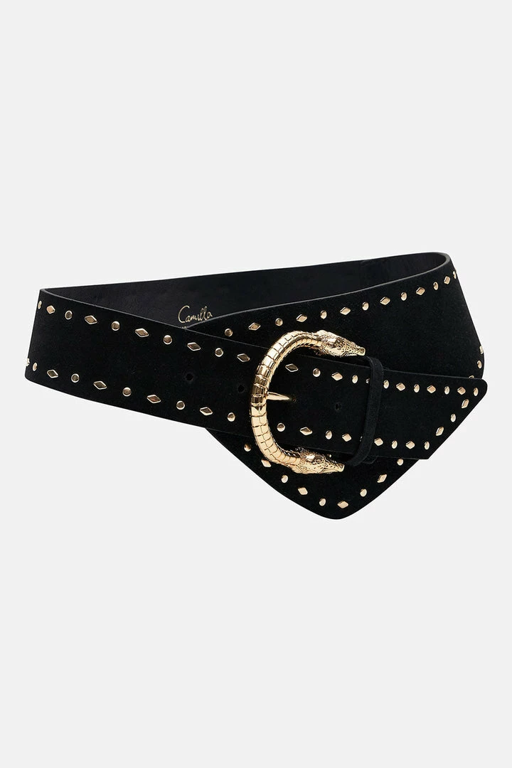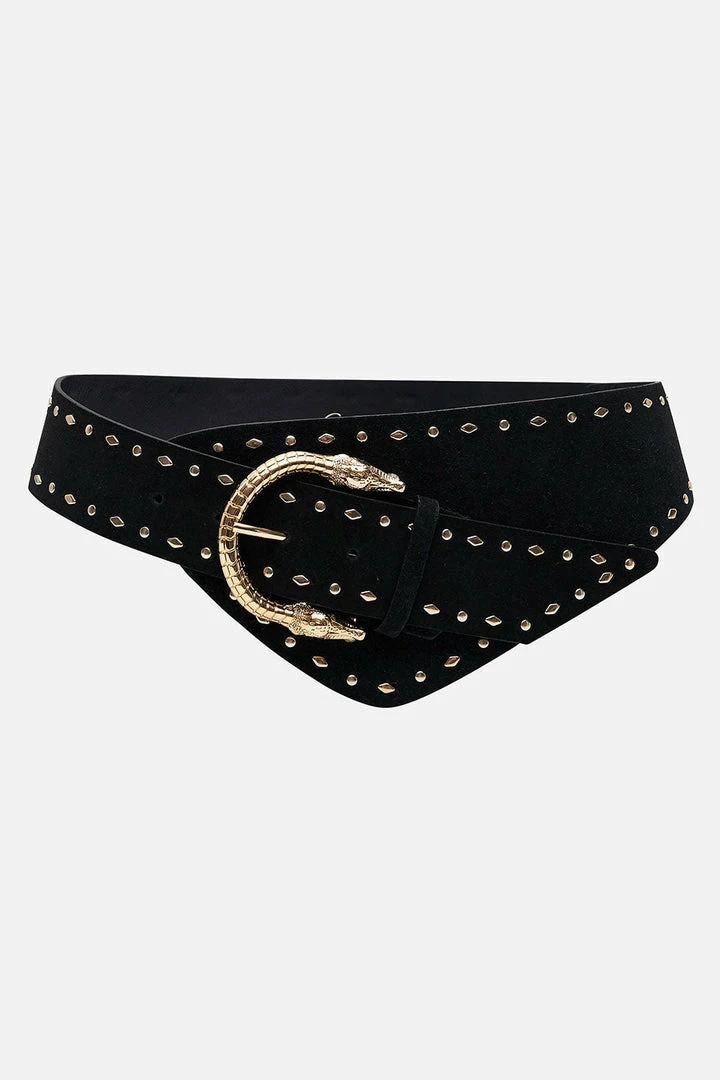 A finishing touch to your ensemble of excess, the Solid Black Asymmetric Belt sports a classic black palette with golden studs. Crafted from soft and durable suede leather, this luxury belt features gold hardware details, an asymmetrical design and a crocodile buckle. Allow flow through your outfit but matching your jewellery to the gold of the hardware.