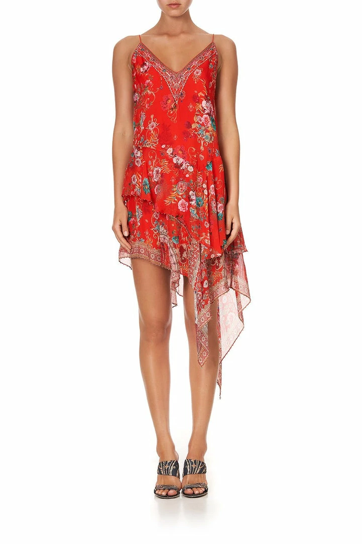Wildly opulent with decadent layers of bright summer red silk, the Cameos Can Can Asymmetrical Flared Dress is exquisitely hand embroidered with lavish beading and CAMILLA crystals. Structured shoestring straps and bust darts give way to a ruffled asymmetric skirt, full of a risqué energy inspired by Paris after-hours. A luxe option for any summer soiree, wear with heels and a knowing smile.