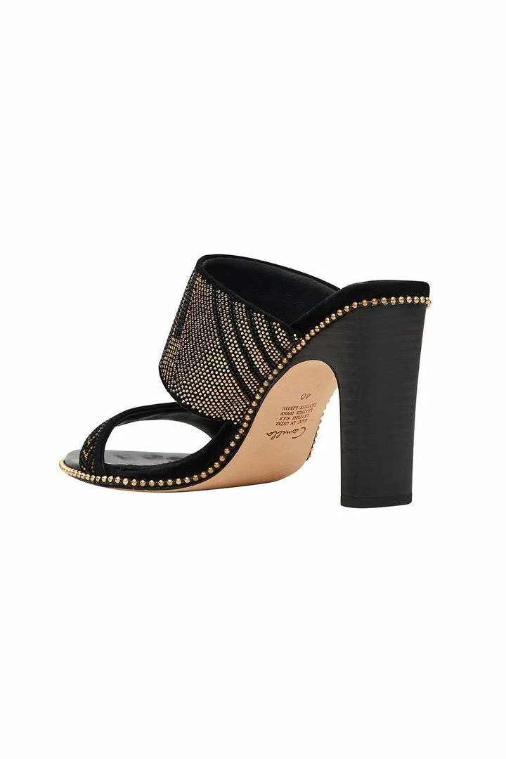 Add a dash of luxe to your step in the Luxe Black Asym Heel Sandal, a strappy statement stiletto. These striking summer heels are hand-embellished with CAMILLA crystals on soft suede and are finished with a golden bead trimming and CAMILLA branding, as well as a luxe quilted interior. Flaunt your footwear with a fierce fit from the Badass Basilica Babes collection.