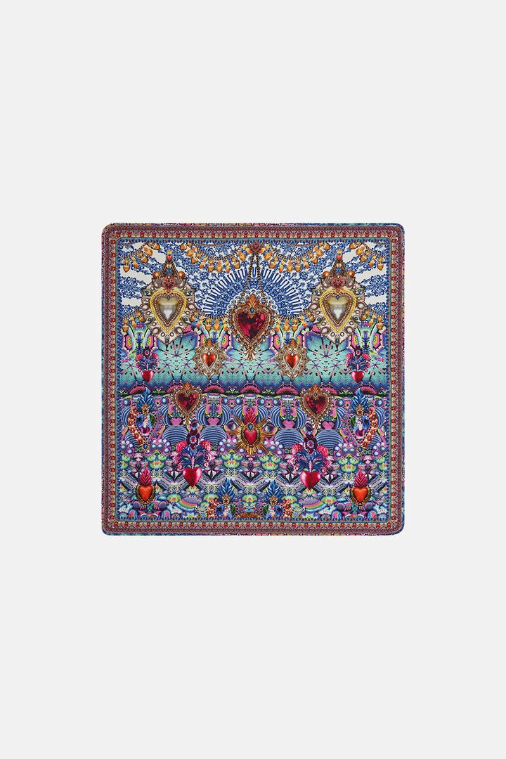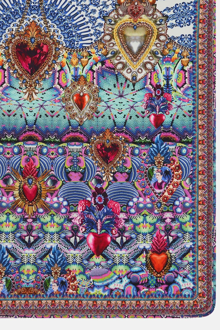Crafted from lavishly soft cotton, our Lucky Charms Babies Blanket cuddles your little one in a vivid mosaic spotted with fuchsia moments, seas of aquamarine, golden amulets and the face of Frida. This luxury baby blanket features a classic square silhouette, contrast trim, a multi-use design and is soft to the touch. A wonderful addition to your little bub’s comforts.