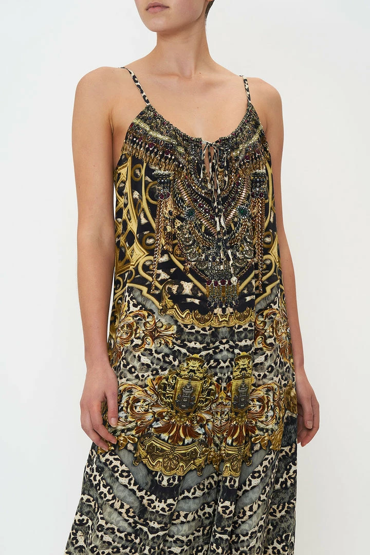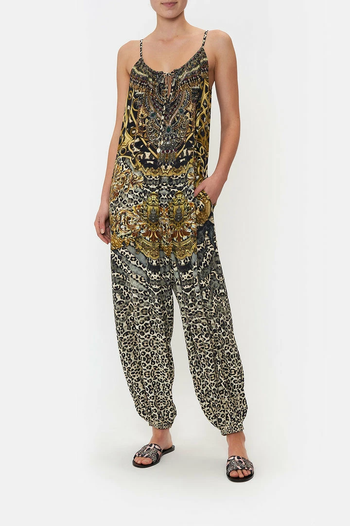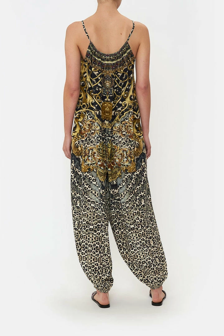 Wild inspirations meeting opulent odes, the Armada Balloon Jumpsuit is enveloped in swirls of leopard print defined by lavish gold baroque detailing and ornate architecture. Crafted from signature CAMILLA silk, this luxury jumpsuit features a voluminous balloon pant, tie-up detailing at the scooped neckline, elasticated cuffs and relaxed silhouette throughout.
