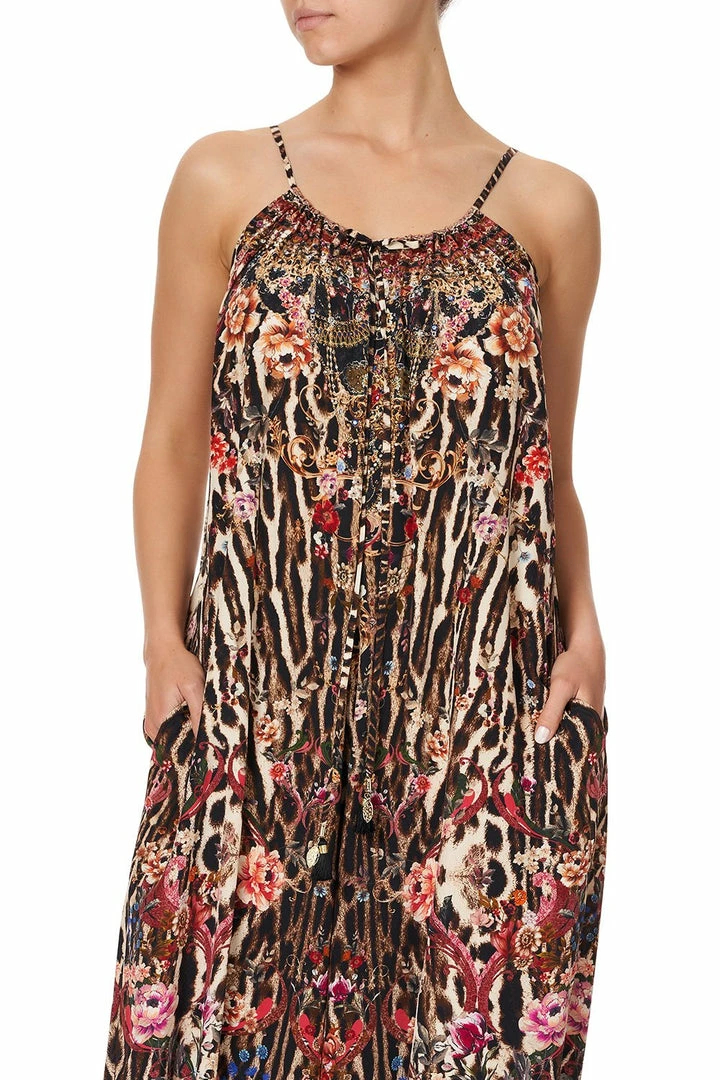 A luxurious boho jumpsuit designed for free movement, the Liv A Little Balloon Jumpsuit is inspired by a sweet seduction amongst fiercely feminine blooms. Crafted with a bold CAMILLA navy blue print placement with hues of florals and leopard print, this floaty one sized jumpsuit billows with even the smallest of movement and features a shoestring strap with tie front detail, elasticated cuffs and is finished with hand applied CAMILLA crystals. Pair with flat sandals for resort luxe, or with sky-rise heels for a boho chic vibe.