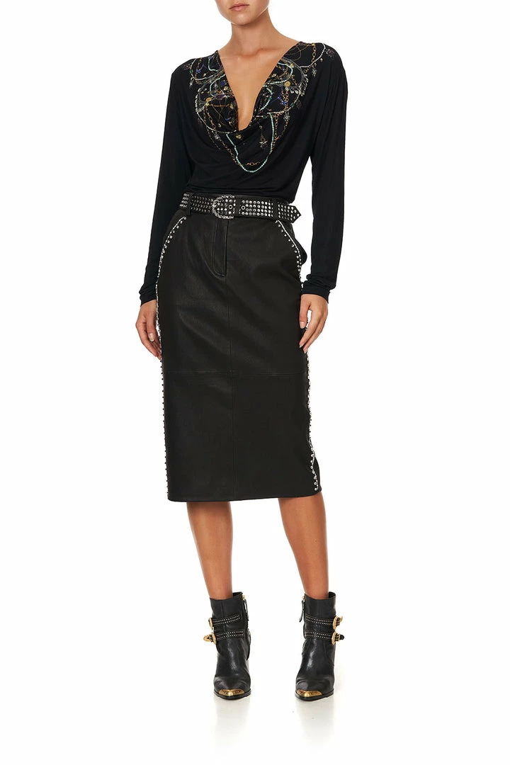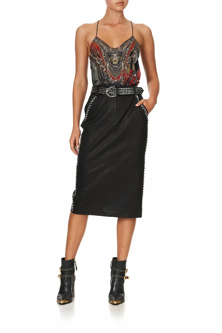 Designed in a fitted silhouette to complement billowing blouses, the Leather Belted Leather Skirt is a classic form fitting piece elevated with CAMILLA touches. The super soft stretch leather is cut in a pencil skirt shape and finished with a fly front closure, practical pockets and belt. Inspired by a couple of British renegades, the punk influences of this season’s collection are exhibited here in the form of striking stud embellishment covering the belt and forming a sharp border down the sides. The versatile black colour pallet ensures this keepsake leather skirt will be a go-to style for years to come. We love to balance its edgy aesthetic with the air of punk romance embodied in the London Calling T Back Shoestring Top.