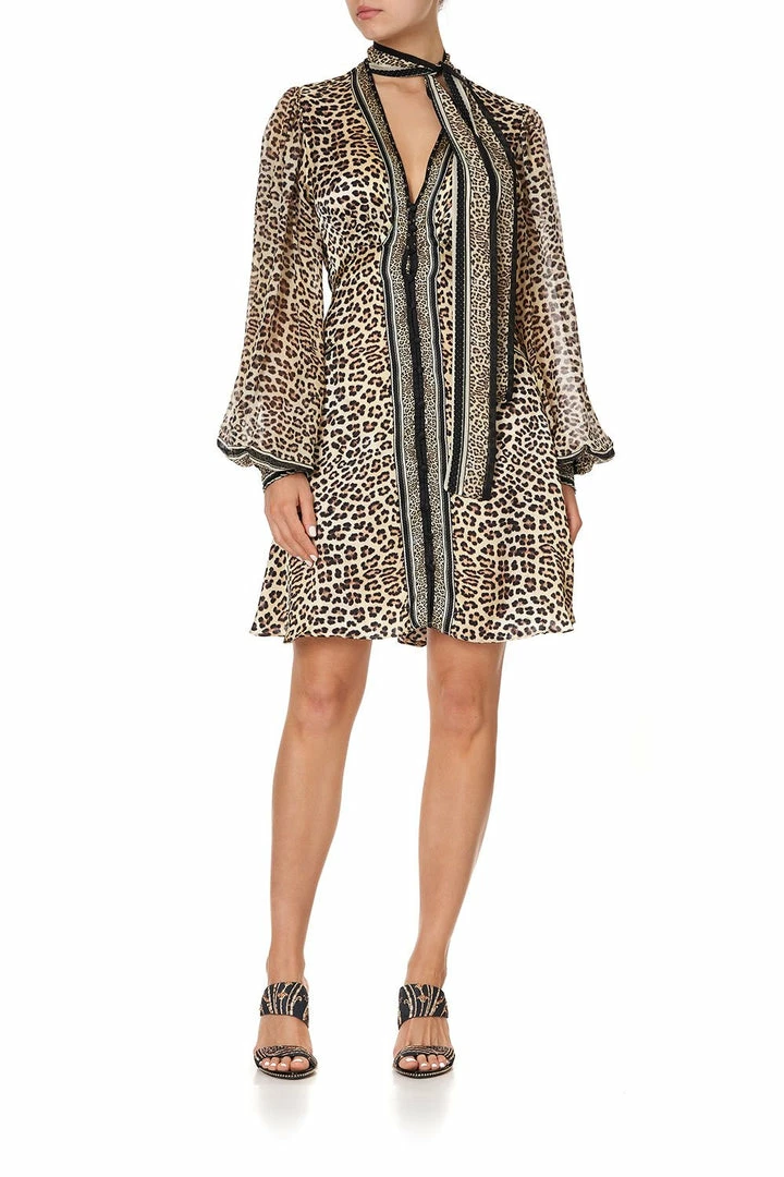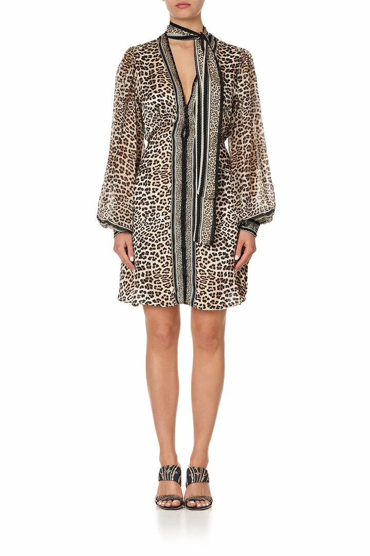 A mesmerising elegant silhouette enchanted by the telling stories of Brigitte, the Sex Kitten Blouson Dress With Neck Tie is crafted in a radiating structural silk leopard print with intricate black detailing. This floaty floor length beauty boasts decadent blouson sleeves with an elasticated cuff at the wrist, button front detailing, a gorgeous neck tie with hand placed CAMILLA crystal embellishments. An essential piece for a serene boheme wardrobe, perfect for a day-to-night occasion.