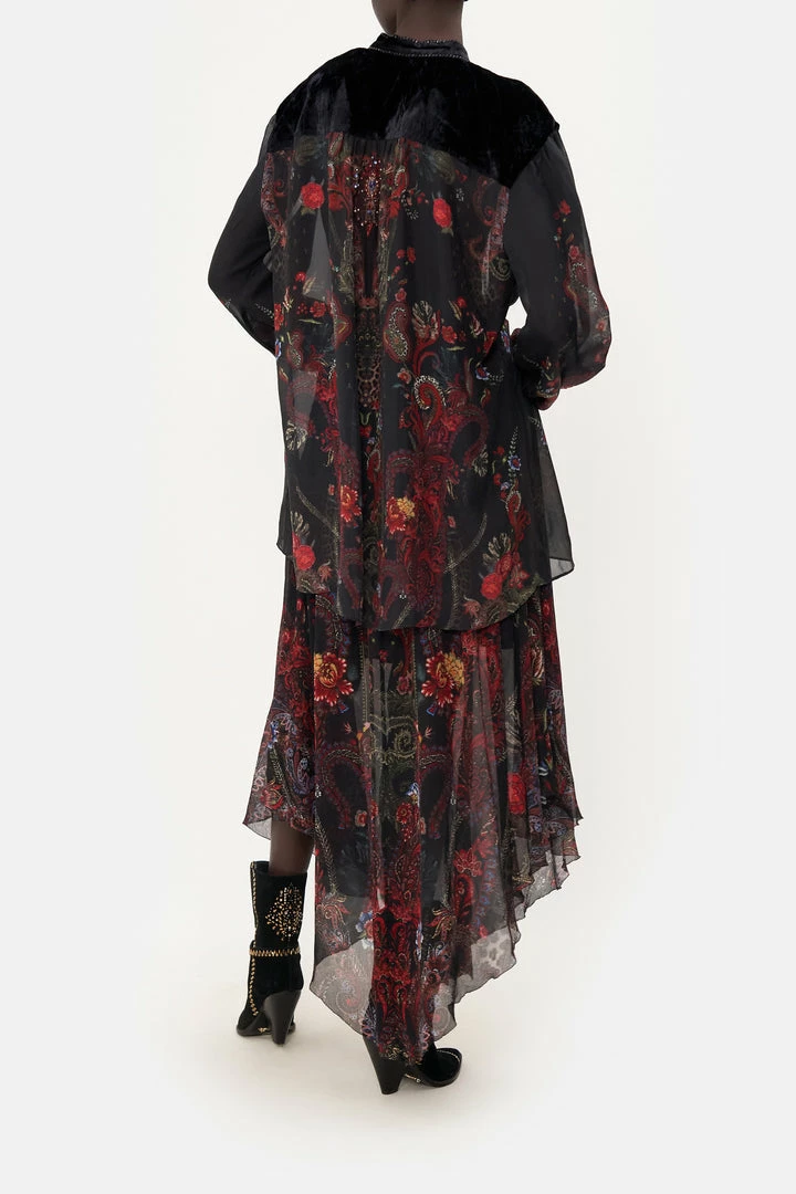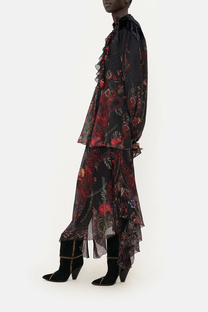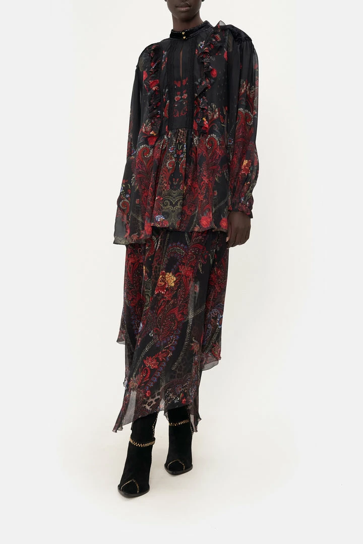 An exquisite frill meets grungy seventies bohemia, the Woodstock Rock Blouson Ruffle Blouse is enveloped in burgundy paisley indulgence, pops of deep crimson and moments of midnight hues. Adorning hand-embellished CAMILLA crystals, this luxury silk blouse features a dainty ruffle panel, high neckline, voluminous blouse sleeves that taper into wispy wrists and a relaxed silhouette that falls into a flared hemline.