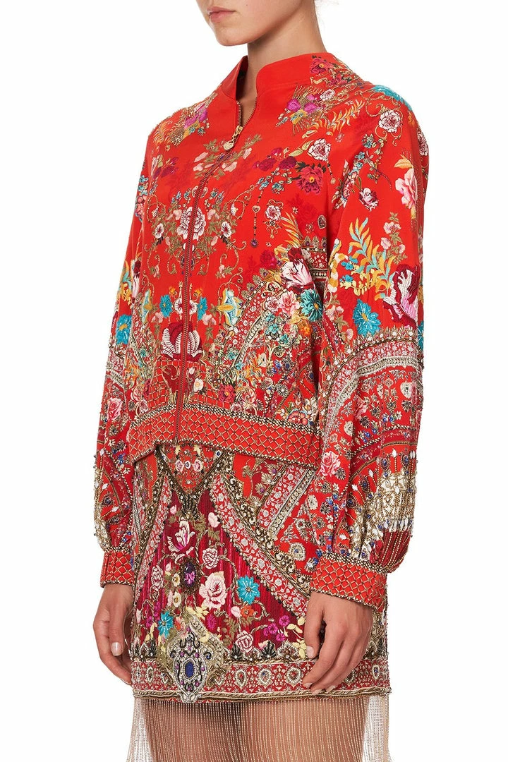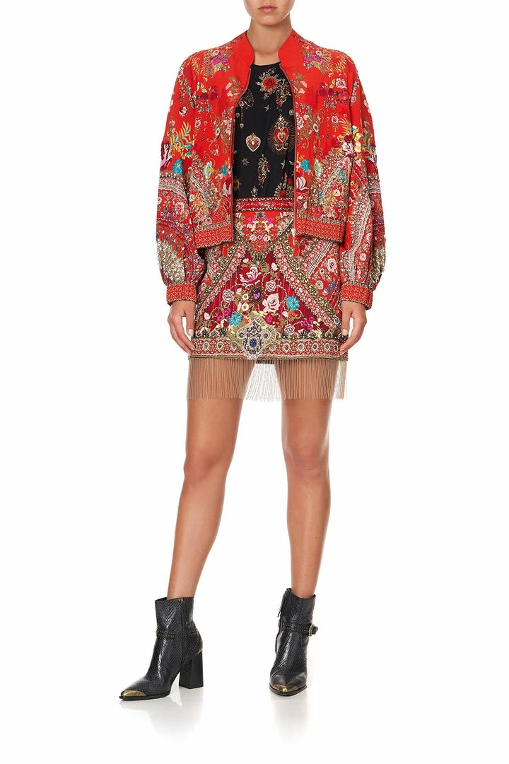 A mesmerising collector’s piece rich in rebellious luxury, the Cameos Can Can Blouson Sleeve Bomber is a fully lined all-over embroidered silk jacket depicting a hypnotic scene of Paris at night. Featuring a generous blouson body and raglan sleeves this silk layering piece is lavishly hand embroidered all over to give a sumptuous luxe finish. At the back, a statement embroidered heart takes centre stage of this cinematic masterpiece. For a breath-taking statement look pair back with the Cameos Can Can Mini Skirt.Â