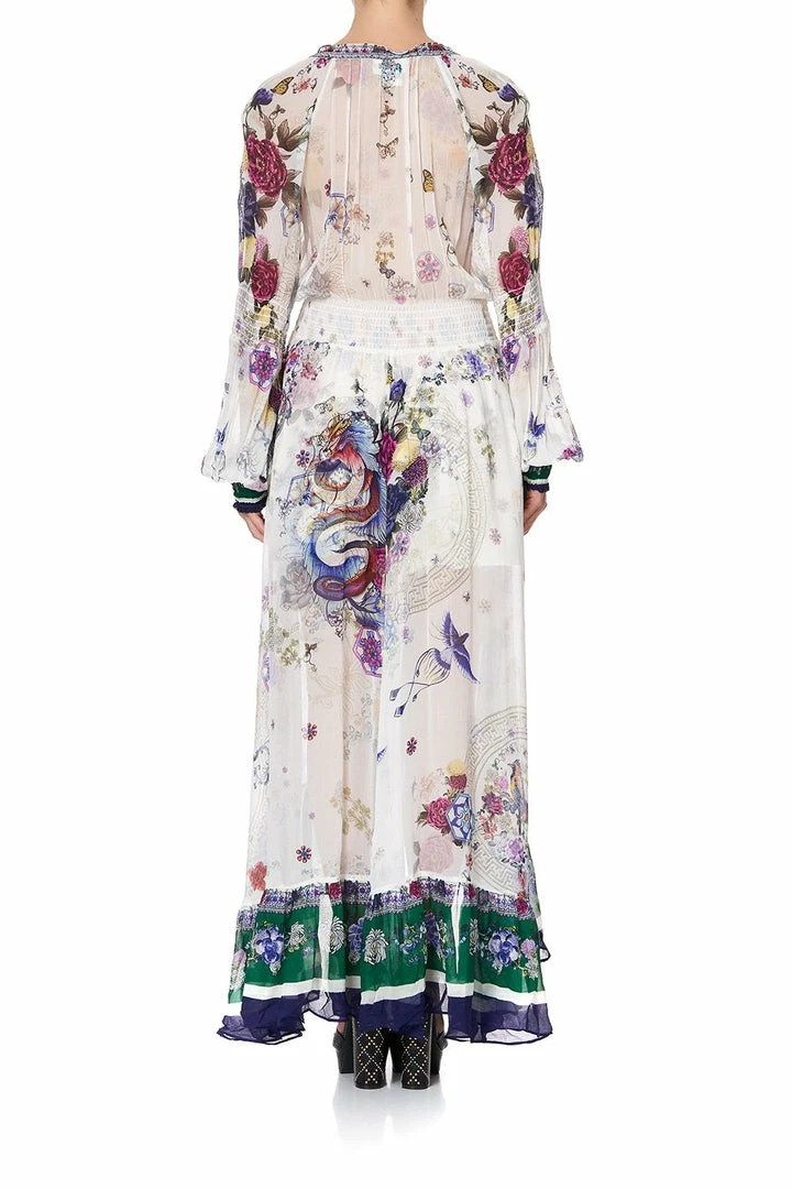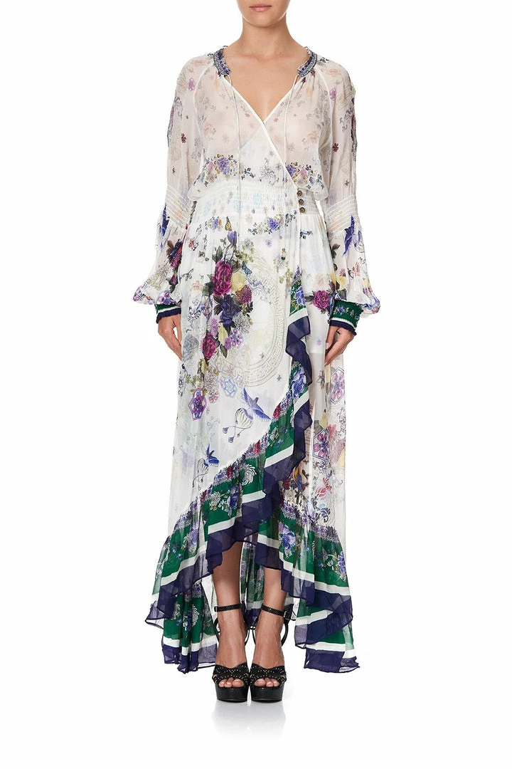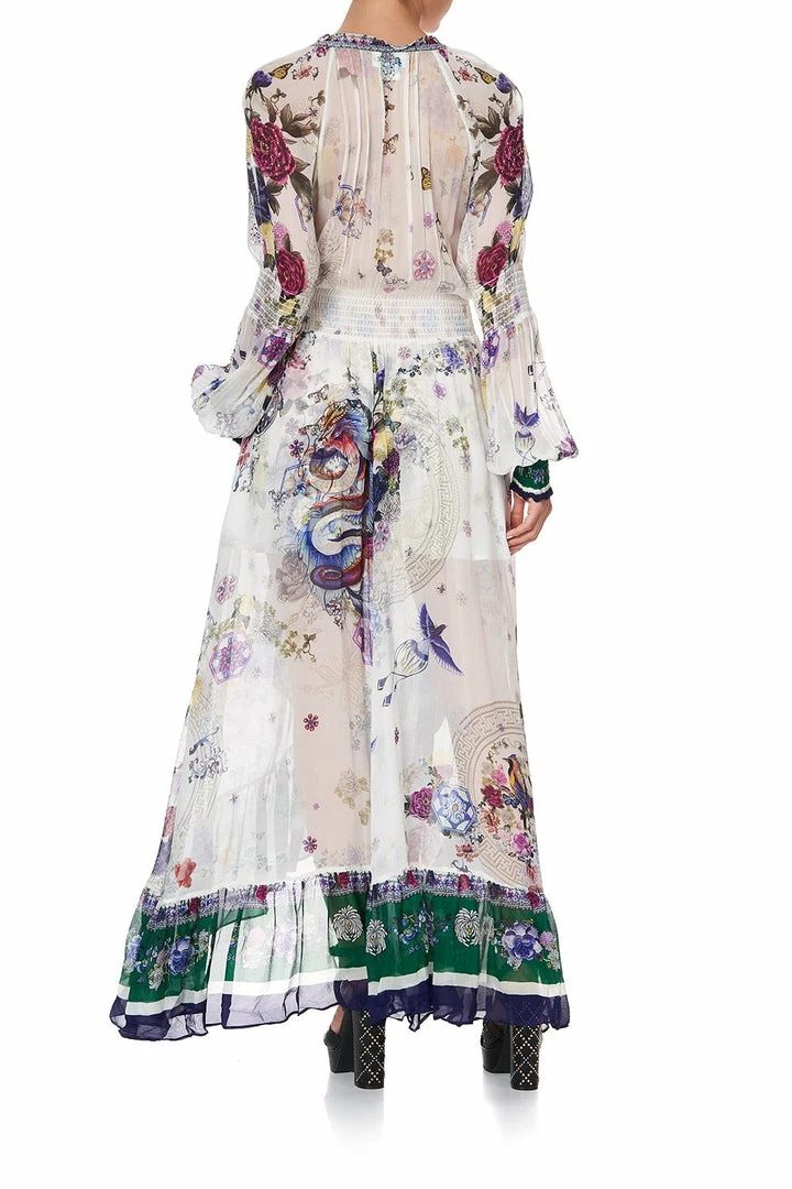 Rich with references to 70s maxi dresses, the Gentle Moon Blouson Sleeve Wrap Dress is mesmerised with scenes of the Chinese Zodiac. Unapologetically floaty, this sweeping floor length beauty is crafted in a silk canvas reminiscent of Chinese zodiac nestled in delicate hand painted florals. Featuring a heavenly frill neckline with ties, peasant-style blouson shirred sleeves and waistline, an alluring ruffled side split and button closure – it is finished with hand-applied CAMILLA crystalling. A whimsical dress essential to any bohemian’s wardrobe, this statement piece can be worn day-to-night for any occasion.