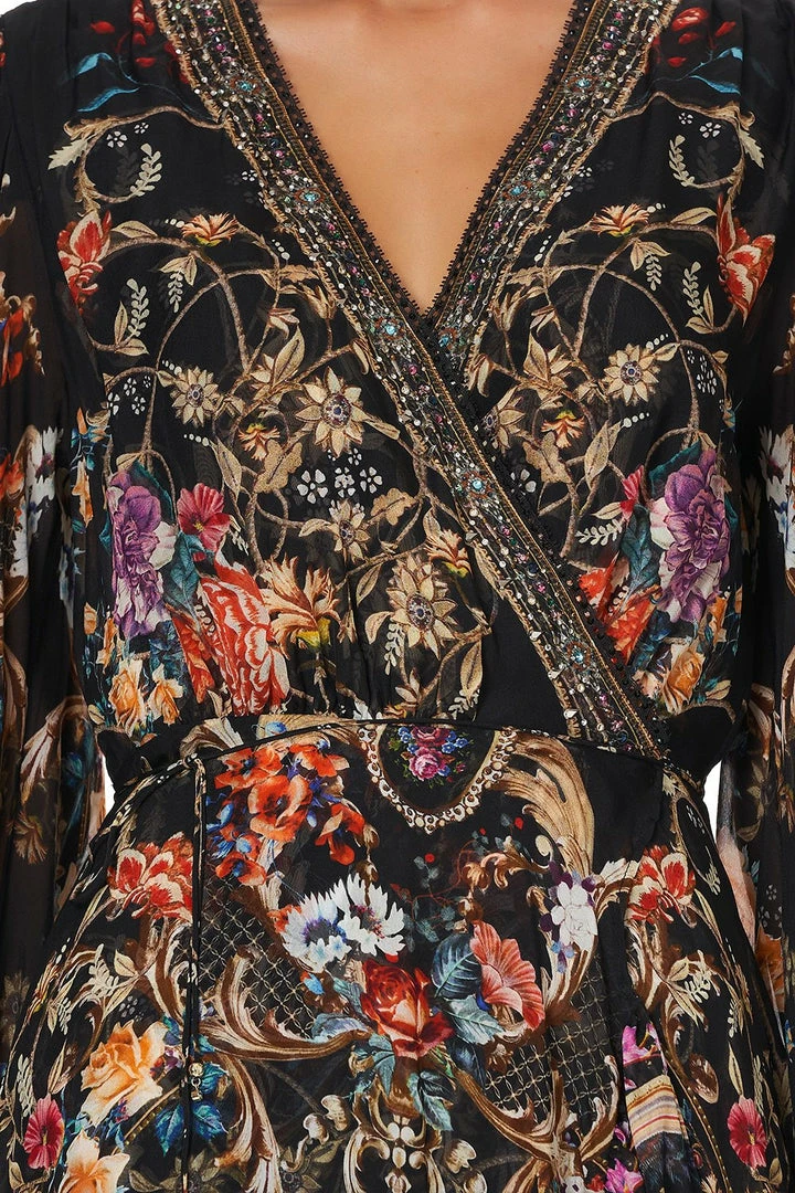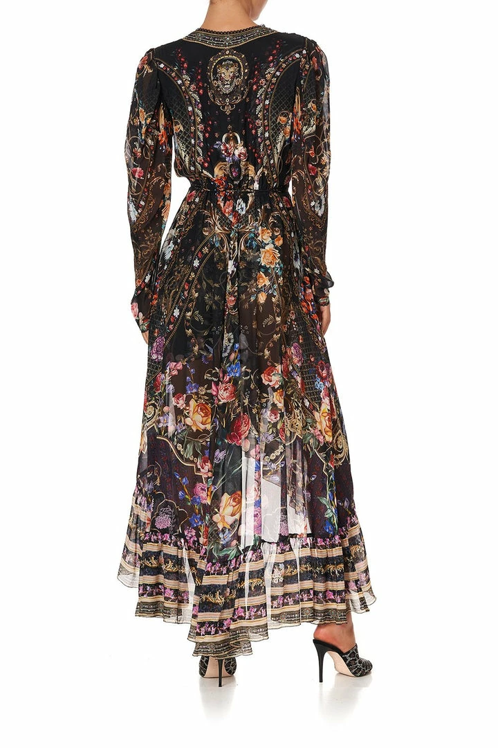 A cultivated wilderness of printed silk and crystal embellishment, the Blushing Manor Blouson Wrap Sleeve Dress is a wondrous boho style with a touch of feminine drama. Crafted with sheer long sleeves, this floor length silk dress is decorated with a mesmerising arrangement of wild perennials, inspired by a carefree English rose. A sensual lace-trimmed wrap front silhouette gives way to a dramatic cascade of ruffles, adorned with a structural border. For a final luxe flourish, a delicate waist tie adds shape and crowned lion on the reverse adds a touch of CAMILLA whimsy. Ideal for day-to-night dressing, style with colourful heels and dance until nightfall.