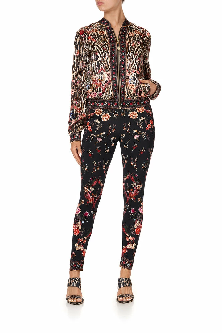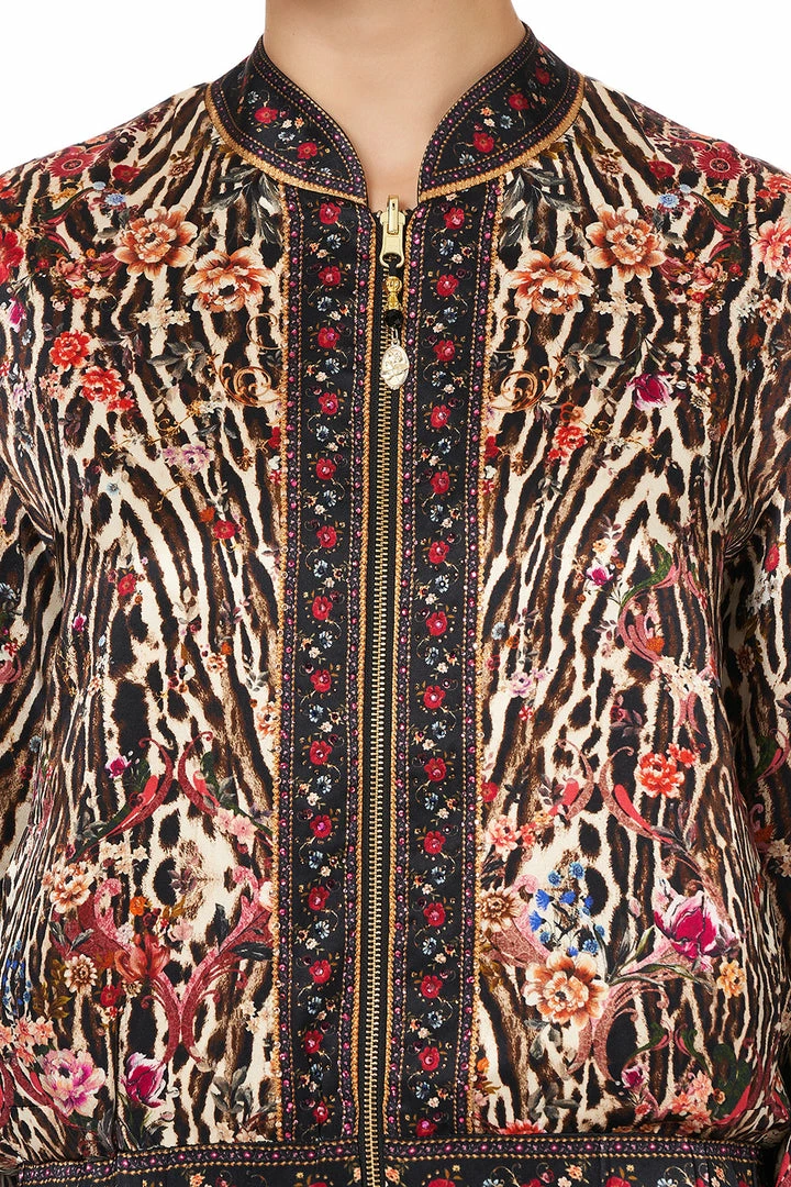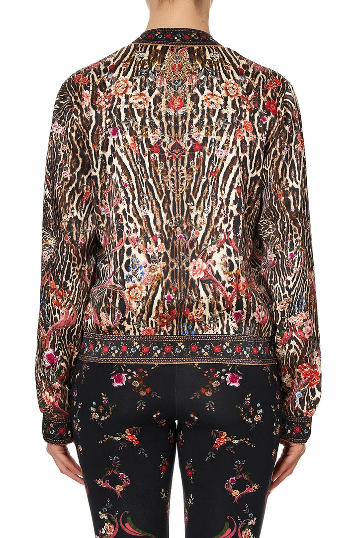 A decadent chic take on a luxe street style staple, the Liv A Little Bomber Jacket is a sweet seduction amongst fiercely feminine blooms. Enchanted with hues of pink florals set upon a fierce leopard background, this piece is crafted in a buttery soft silk featuring an elasticated cuff and hemline, front pockets, is fully lined and finished with hand placed CAMILLA crystal embellishments. Pair with the Liv A Little Shirred Waist Pant for a dazzling date night ensemble.