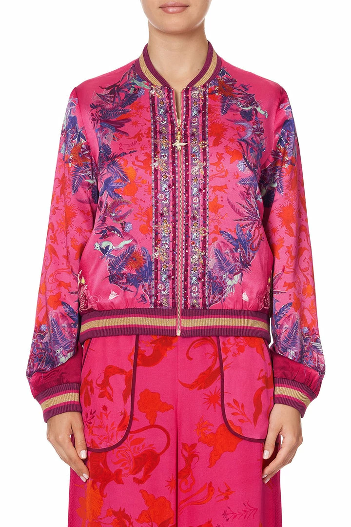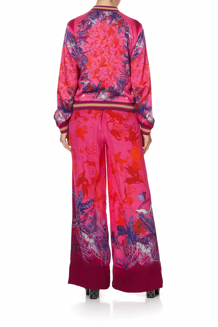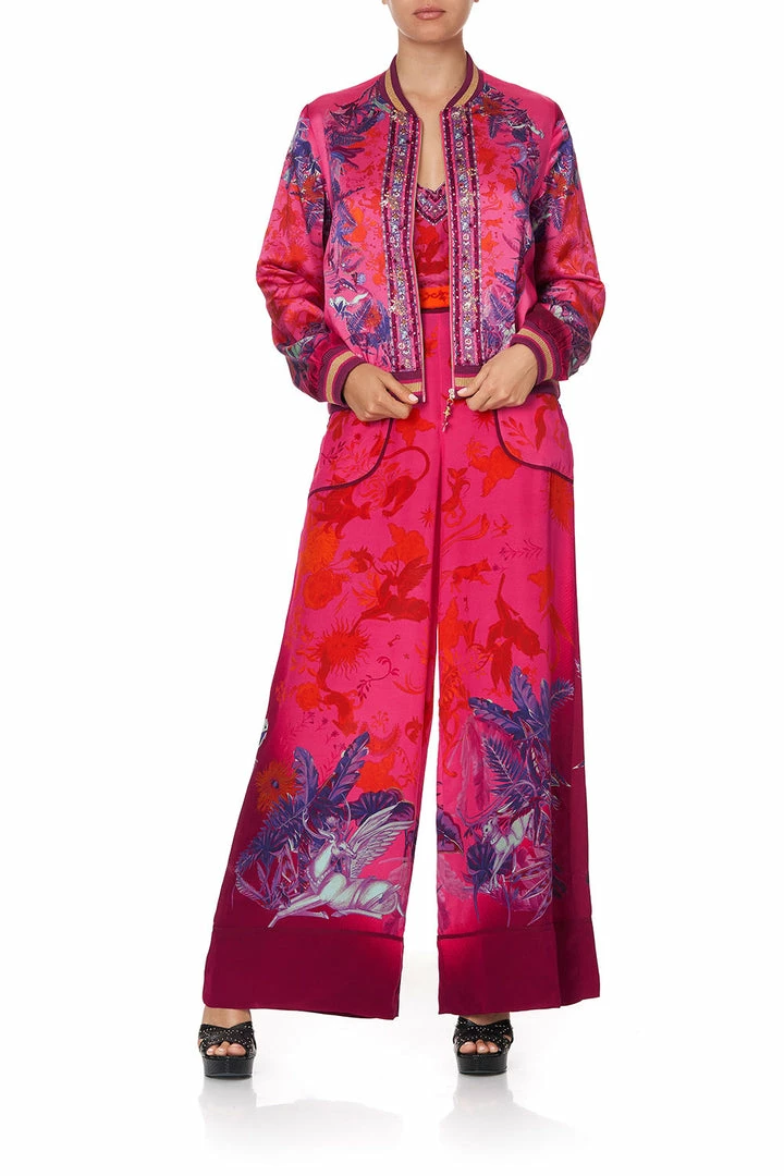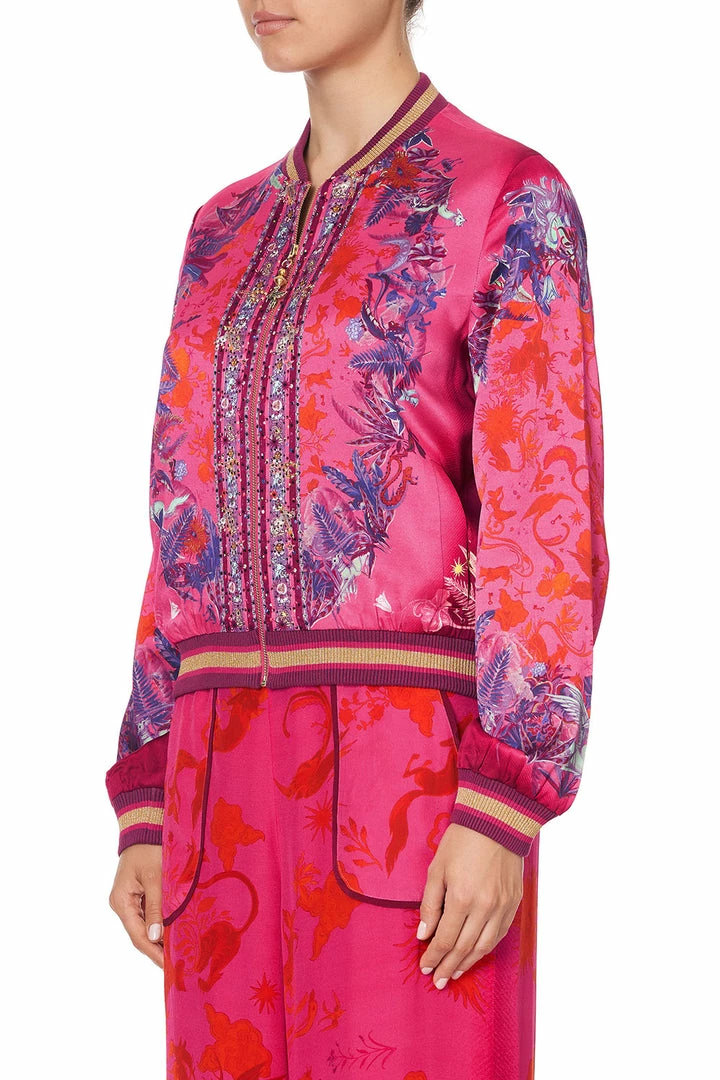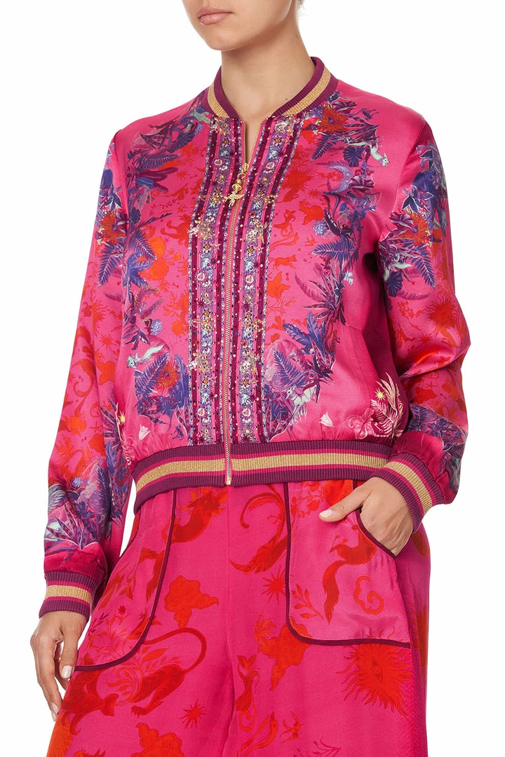 A street style classic jacket elevated with a radiant astrology-inspired print; the Tropic of Neon Bomber Jacket is sportswear luxe. Crafted in a buttery soft yet structured printed silk that honours studies of astrology, this pink and red 80s style jacket is fully lined and features ribbed cuffs, collar and hem, as well as front pockets and hand-applied crystal embellishments. A masterpiece of effortless cool, wear over matching Tropic of Neon Lounge Trouser with Cuffs.