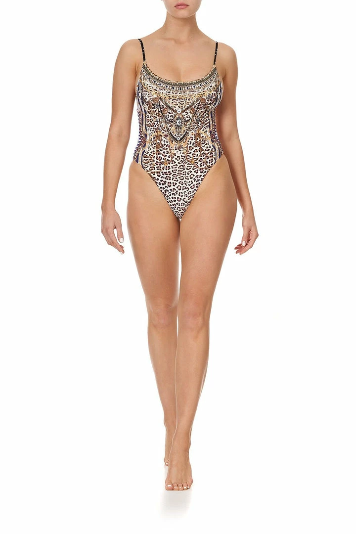 Bygone bourgeois meets French Riviera, the Dear Brigitte Brazilian Bottom One Piece is a cheeky piece reminiscent of Brigitte and the iconic nautical stripe she famously wore, as well as her lifestyle in St Tropez. This printed one piece features a flattering Brazilian bottom coverage, high leg line, comfortably fits an A-C bust as well as delicate hand placed CAMILLA crystal embellishments as detail.