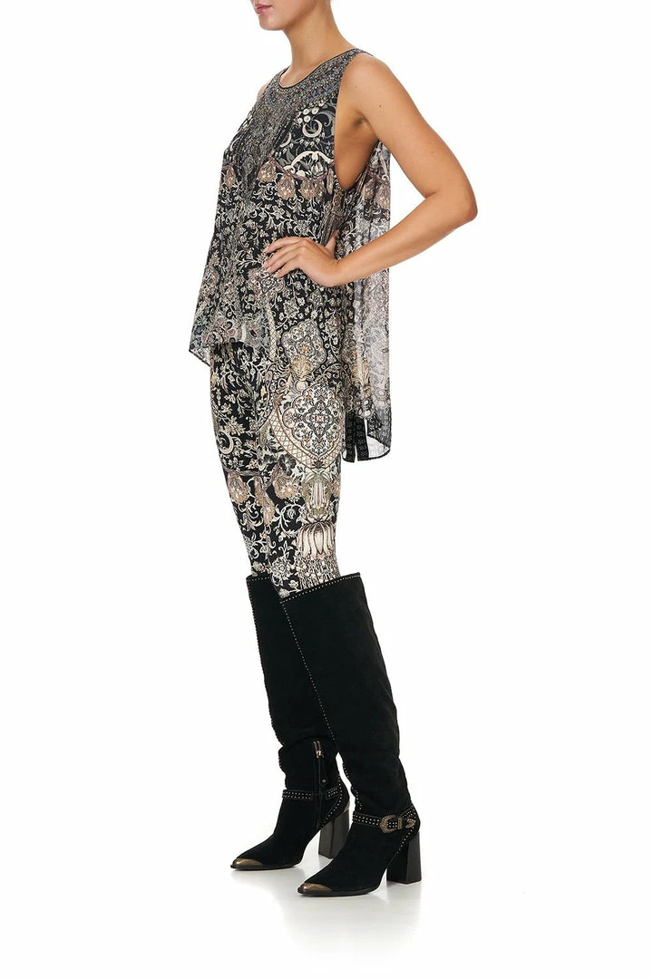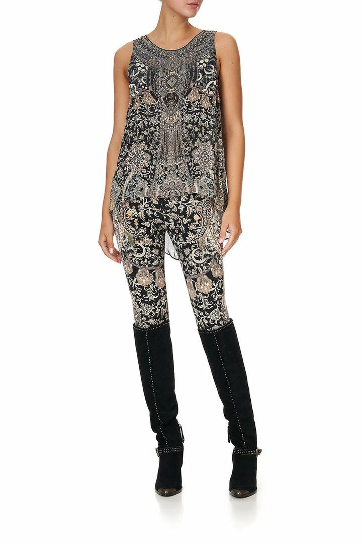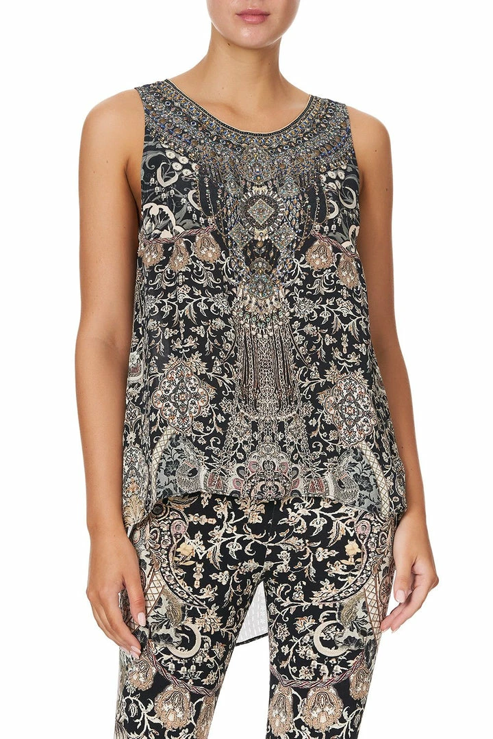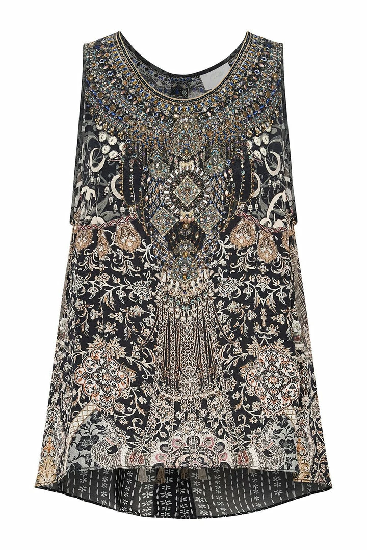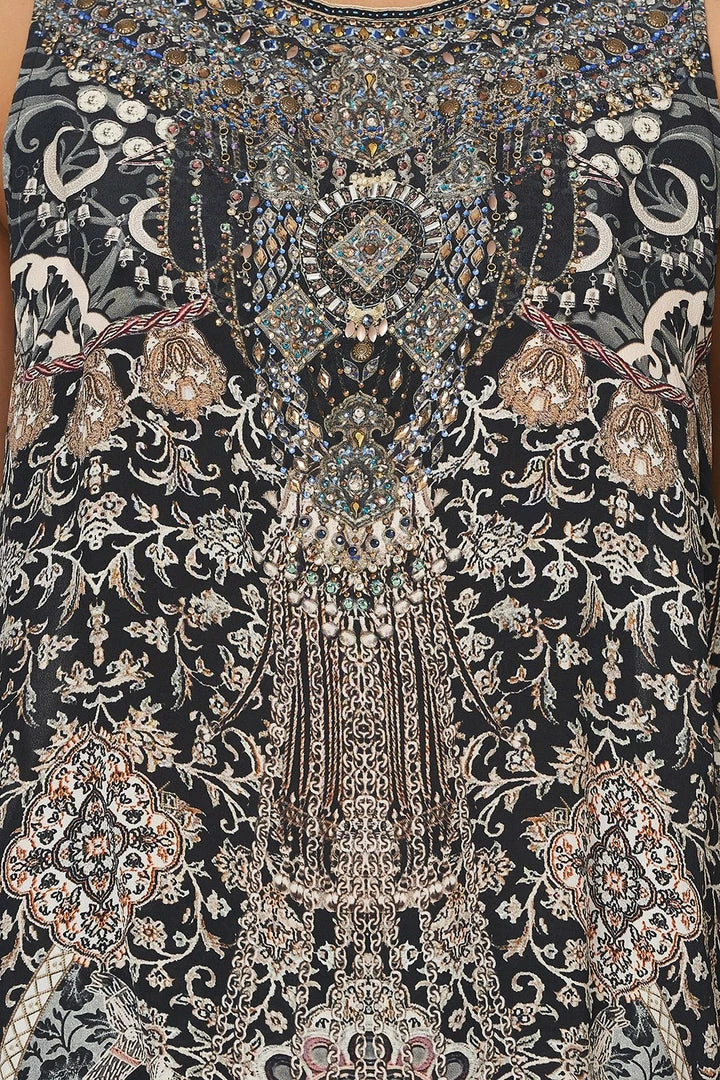 Add a statement touch to an outfit with the Dust Her Off Button Back Top. This silk top can be paired with jeans by day or pants in a contrasting print by night, as its relaxed fit makes it so versatile. Soft pink florals in a print inspired by antique relics are punctuated by CAMILLA crystals for a statement top.