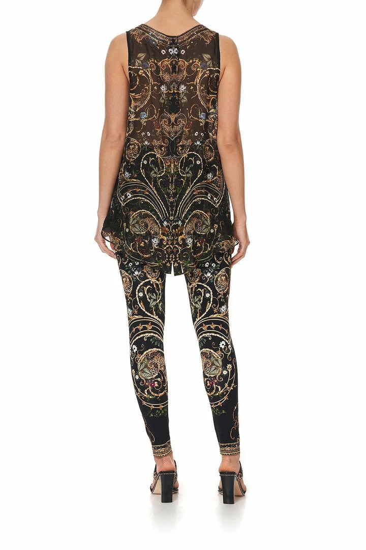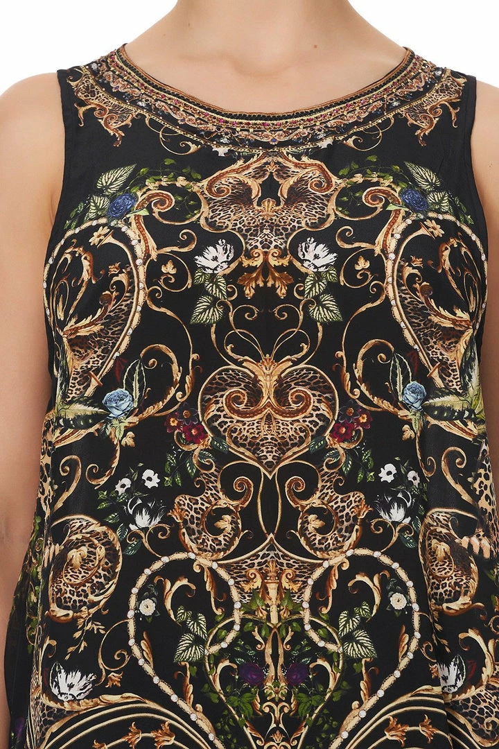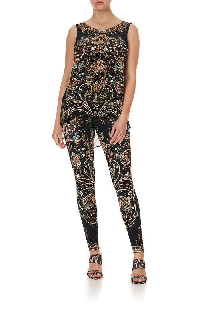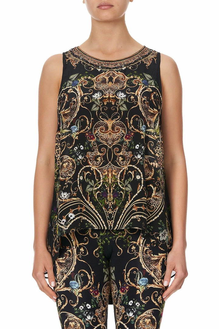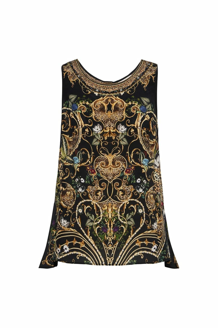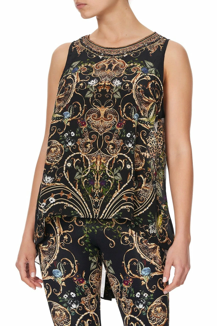 Decadent with gold chains intertwined with leopard, the Studio 54 Button Back Top is crafted in silk reminiscent of Grace Jones and the studio 54 era. This classic top features a relaxed it, a button back closures, a flattering high low hemline style and finished in hand placed CAMILLA crystal embellishments. Pair with the Studio 54 Basic Drop Crotch Pant with Front Pleats for an elevated weekend casual outfit.