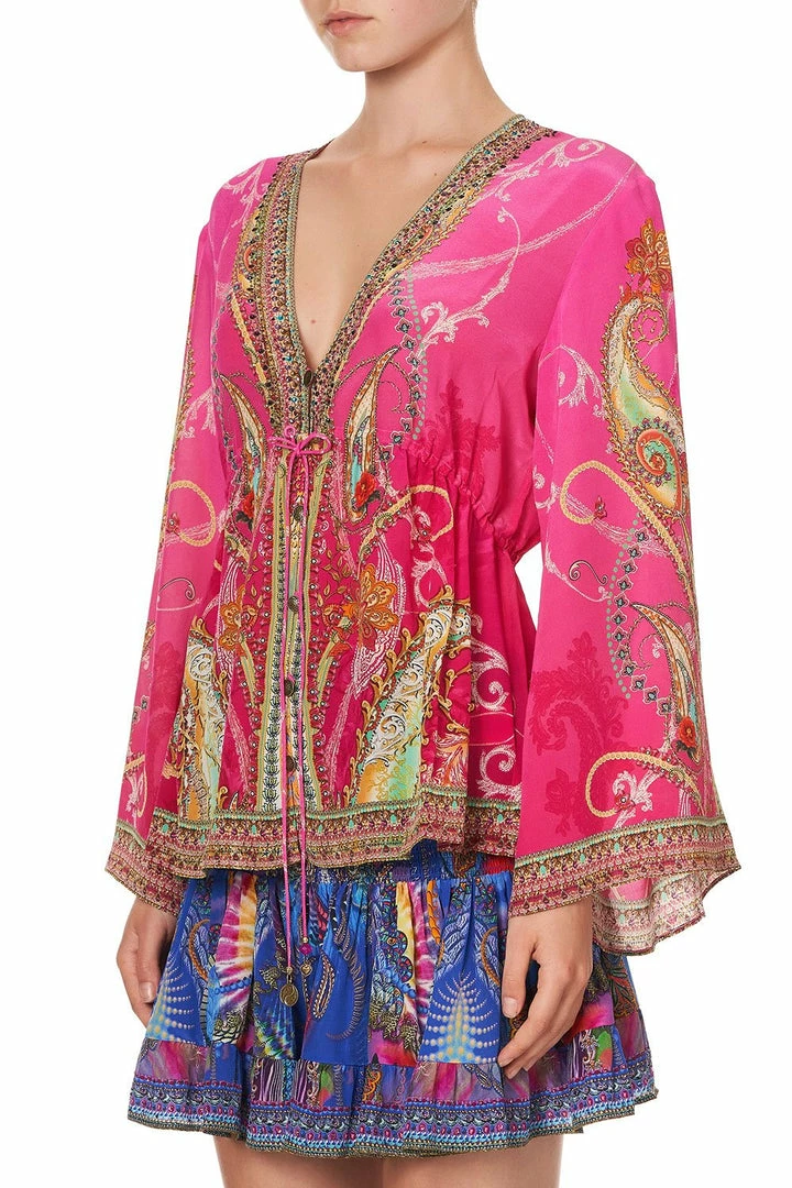 Versatile in silhouette, scandalous in soul, the Rainbow Rhythm Button Down Tie Waist Blouse is a softly tailored pure silk shirt inspired by a flurry of passionate royal affairs. Hot pink and royal gold accents sweep across the luxuriously relaxed fit, highlighted with hand-placed CAMILLA crystals and framed with an adjustable waist tie. Crafted with a smart V-neckline and blouson bodice, this long sleeve blouse works beautifully styled back with the Psychedelica Layered Frill Skirt for a chic business wear ensemble or with jeans for an equally stunning casual look.