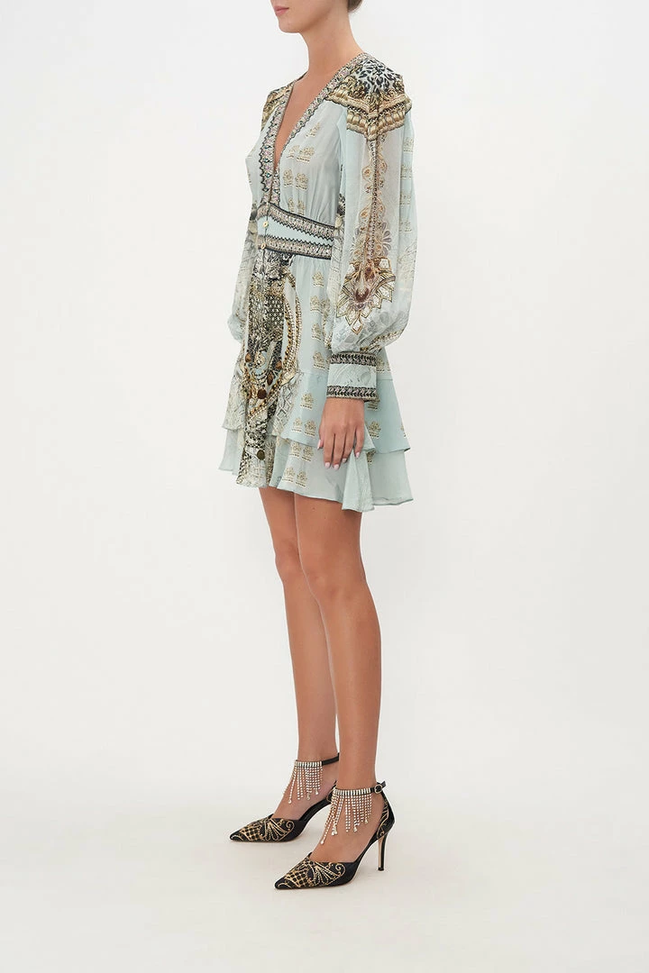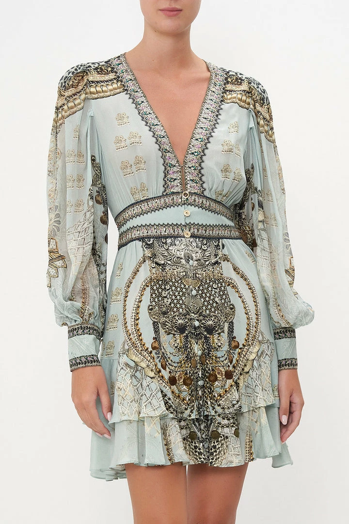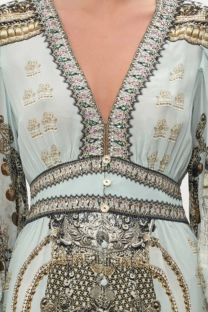 Dainty dipped in all that is whimsy, the Free Espiritu Button Front Frill Dress encases our imagination in a cascade of silver and gold accents as a sea of sky hues is enveloped in chain details. Adorned with hand-placed crystal embellishment, this luxury silk dress features a statement blouson sleeve, metallic button detailing, a contrast waistband and a relaxed frilly hemline.