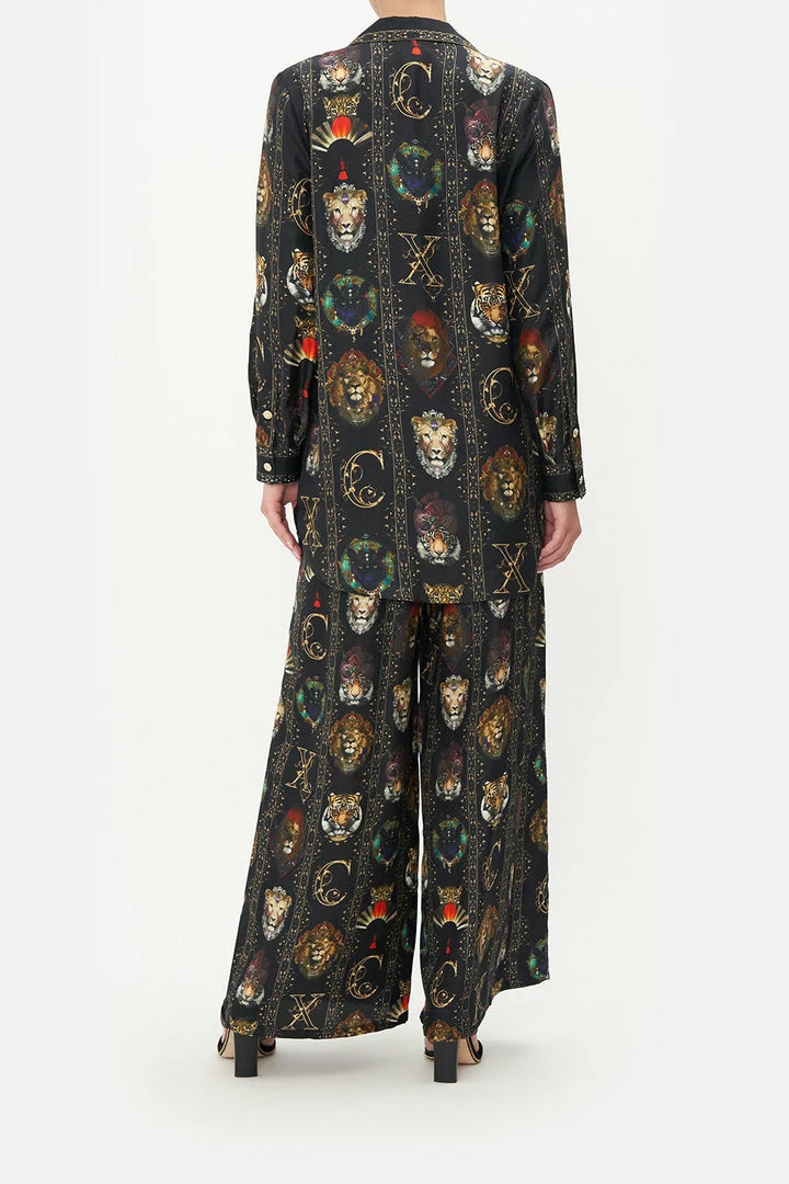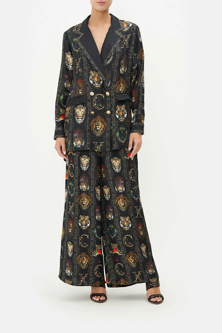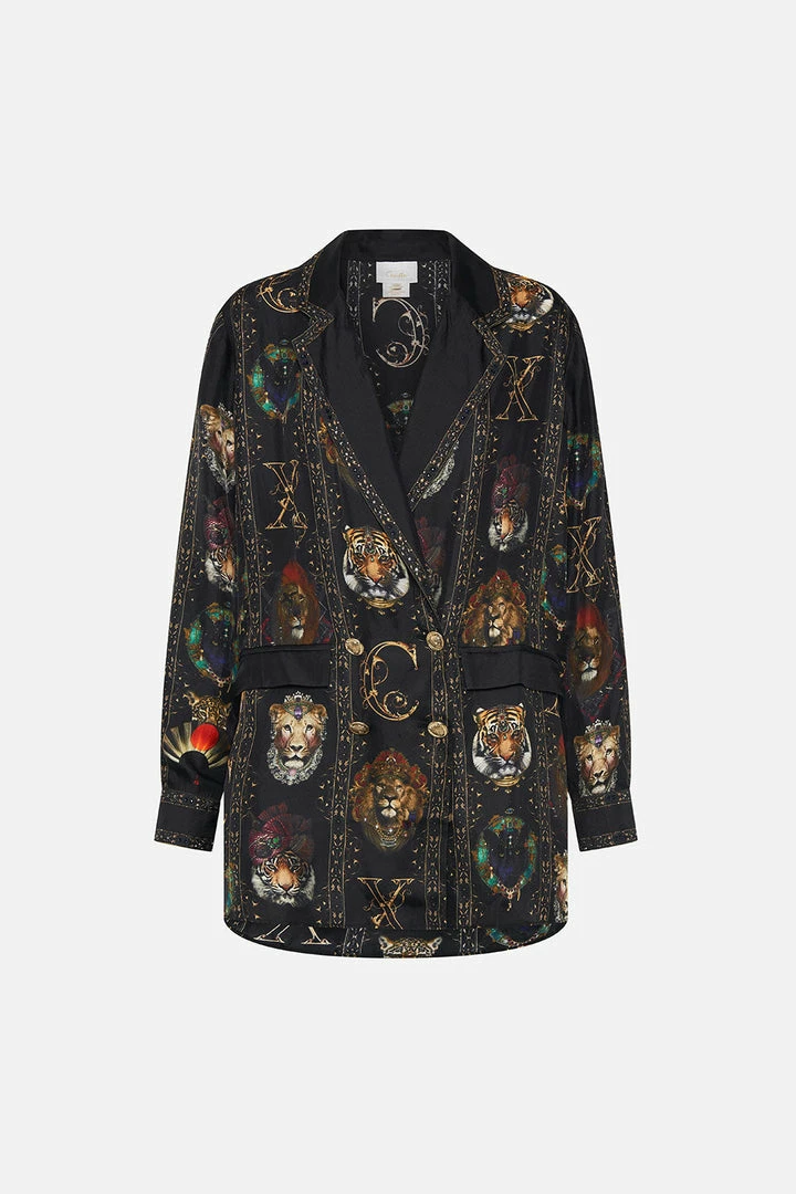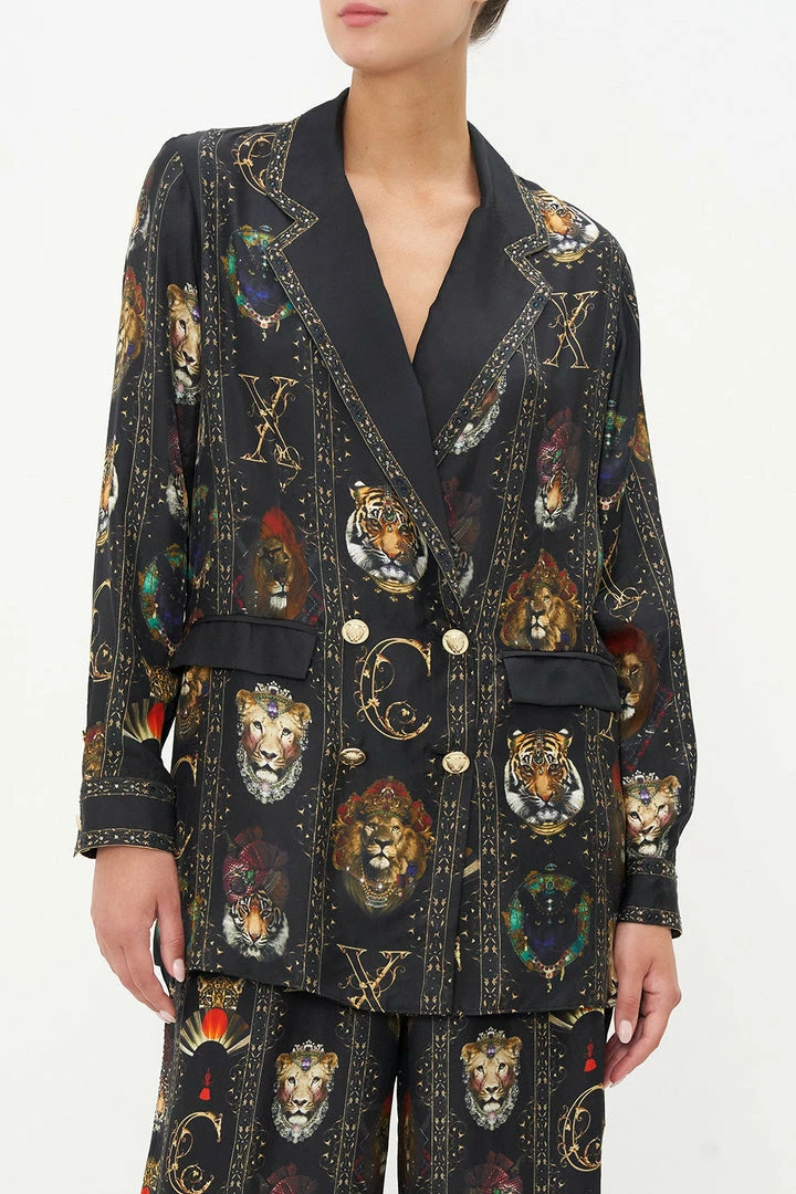 The essential blazer wrapped in striking feline eyes, the Jaggis Jewels Double Breasted Soft Jacket melts the powerful poker faces of tigers, lionesses and panthers as they sit amid gold baroque chain details into effortless matrimony. Adorned with hand-embellished crystals, this luxury silk blazer is home to button fastening, a curved hemline, contrasting cuffs and collar as well as a delicately relaxed silhouette.