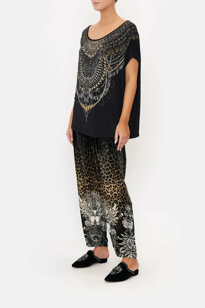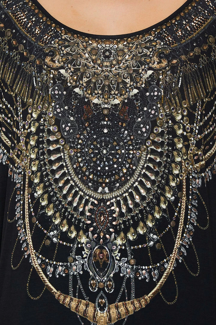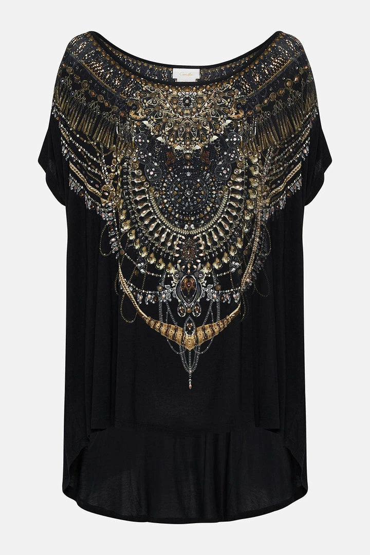 Opulently adorned with cascades of crystal, the Order Of Disorder Loose Fit Tee sports a sea of midnight tones adorning an amulet dipped in golds, bronze and rich silver. Crafted with hand-embellished CAMILLA crystals, this luxury tee features a generous round neckline, a relaxed silhouette, cropped sleeves and a shaped high-low hemline.