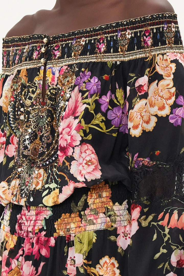 All that is wispy meets blooming bohemia, the Libertine Lady Off Shoulder Short Dress melts cascades of blush botanicals, florals dipped in canary hues and vines of slated green upon a sea of midnight tones into effortless matrimony. Adorned with hand-embellished crystals, this luxury silk dress features shirring at the off-shoulder neckline, waist and cuffs to cinch and shape, a billowed mini silhouette and a delicately soft blouson sleeve. Take this number into your everyday outfit with the complement of a white sneaker.
