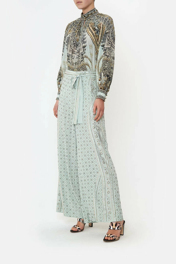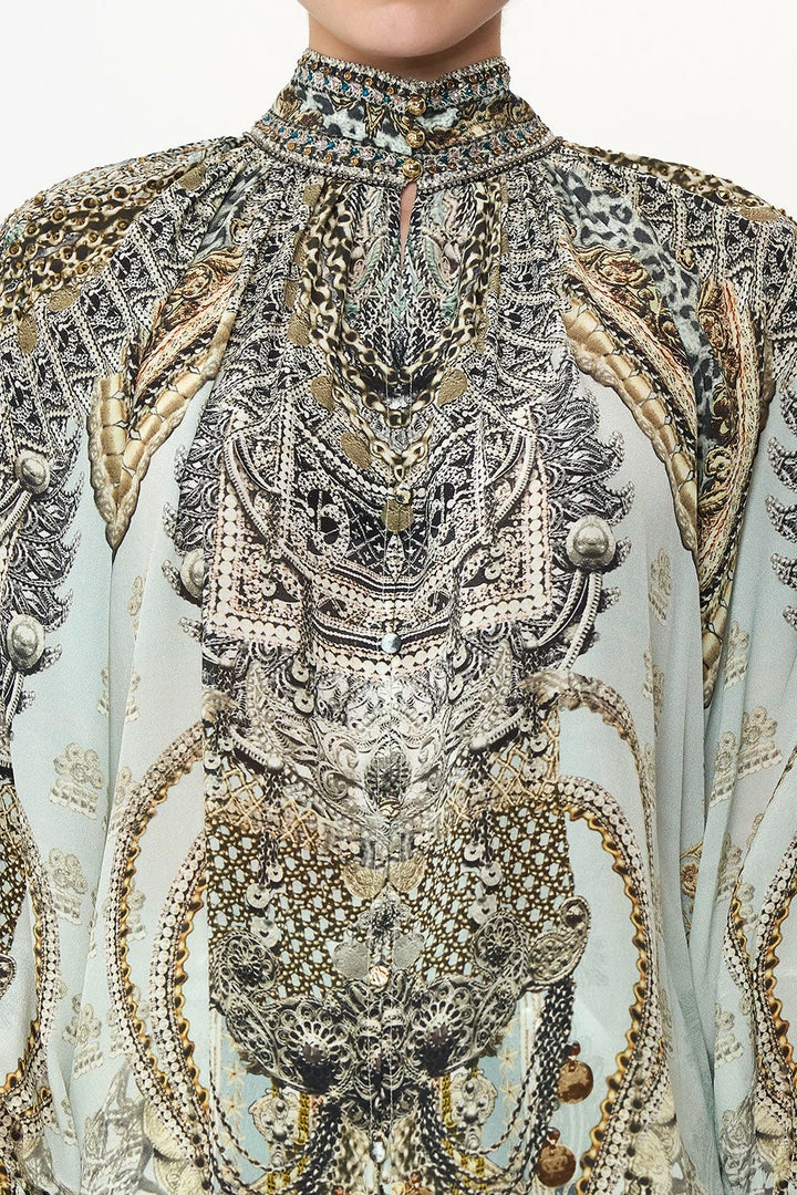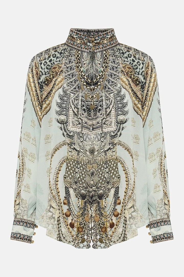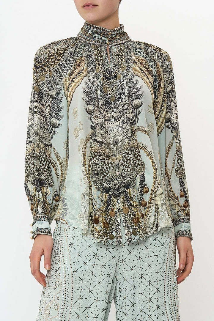 A weaving of intricate proportions, the Free Espiritu Raglan Button Up Shirt is dipped in a cascade of silver and gold accents as a sea of icy blue hues is enveloped by chain details. Crafted with hand-embellished crystal adornments, this luxury silk blouse plays host to a high collar adorned with gold button hardware, a billowy blouson sleeve that meets a contrast cuff and a softly relaxed silhouette. Create shape by styling with a high-waisted trouser.