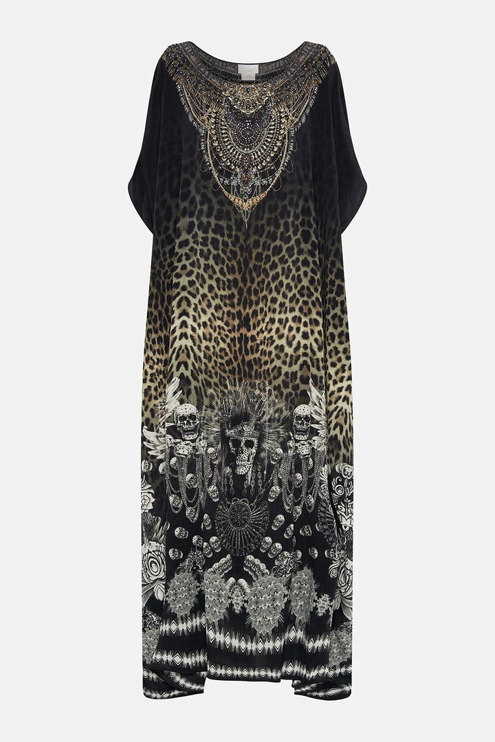 Enwrapped in a grungy ode to Mexico, the Order Of Disorder Round Neck Kaftan fuses a deep shade of midnight adorning classic leopard print, ivory-dipped skulls, metallic chain details and wispy featherings into utter matrimony. Adorned with hand-embellished crystals, this luxury silk kaftan features a generous rounded neckline, cropped sleeves and a relaxed maxi silhouette. With so many ways to wear, transform your kaftan into mini dresses, luxury layers, maxi skirts and shapes of Grecian proportions.