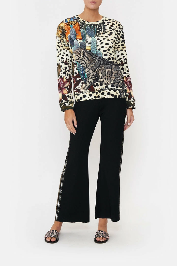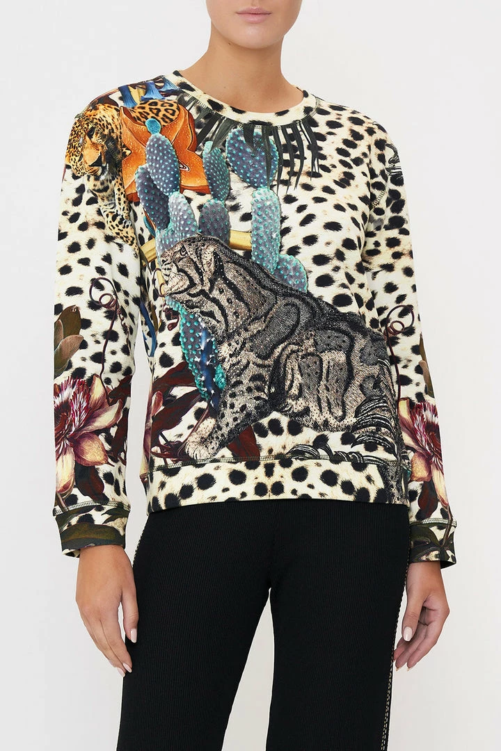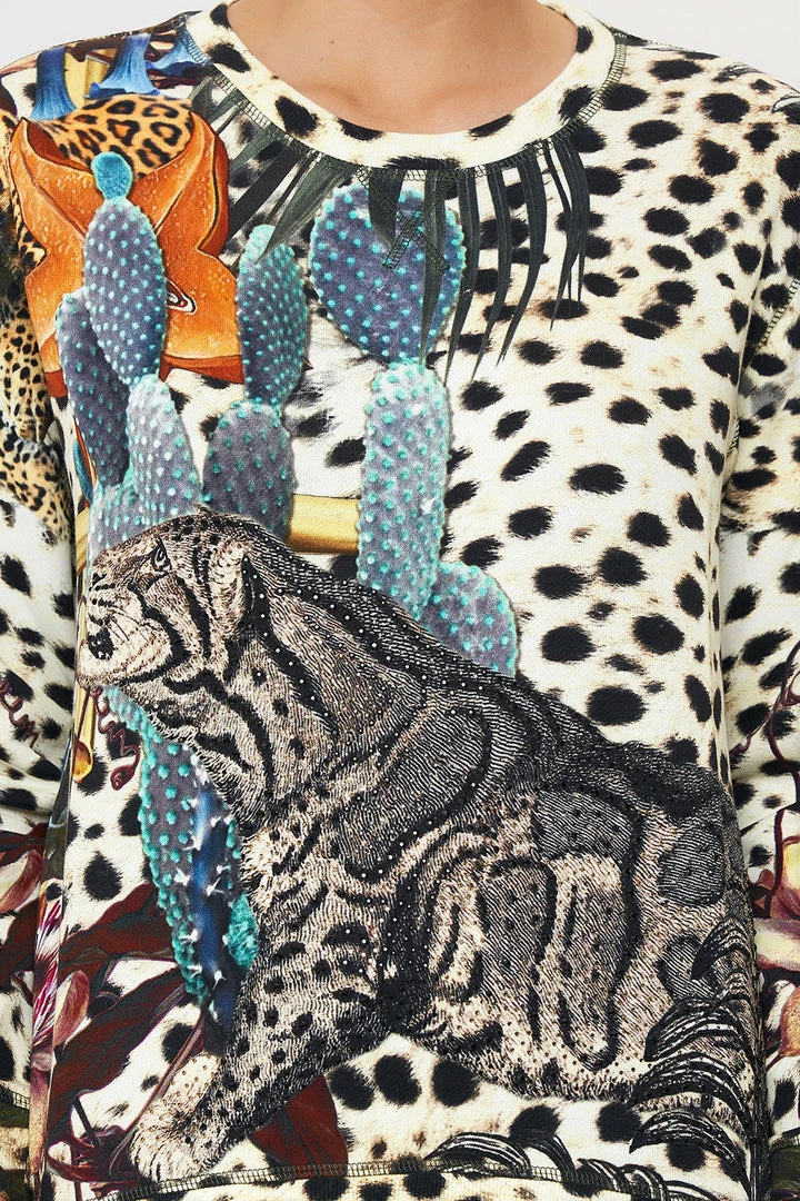 An elixir of Pachamama’s highest divines, the Natural Instinct Round Neck Sweater is enveloped by a soft cheetah print adorning slated blue cacti, big cat portraits and exotic botanicals. Crafted from luxe breathable cotton, this luxury winter jumper sports an oversized relaxed silhouette, a classic rounded neckline, ribbed accents and a subtle drop shoulder.