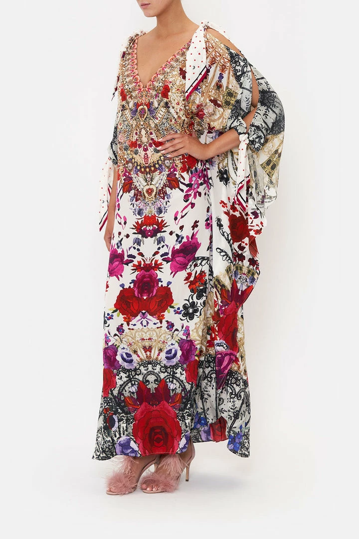 A cascade of Spanish flair and poetic polka, the Reign Of Roses Scarf Tie Kaftan greets a realm of soft white hues with crimson roses, ornate lace fans and hints of golden details. Crafted from lavish silk, this luxury kaftan features tie-up shoulder details, a deep v neckline, wide statement sleeves, hand-embellished CAMILLA crystal and a relaxed maxi silhouette.