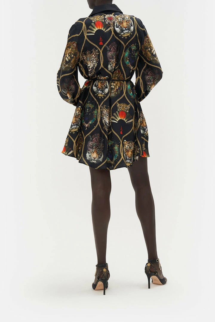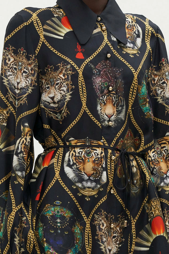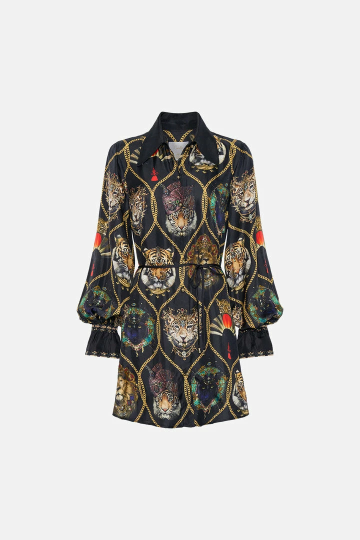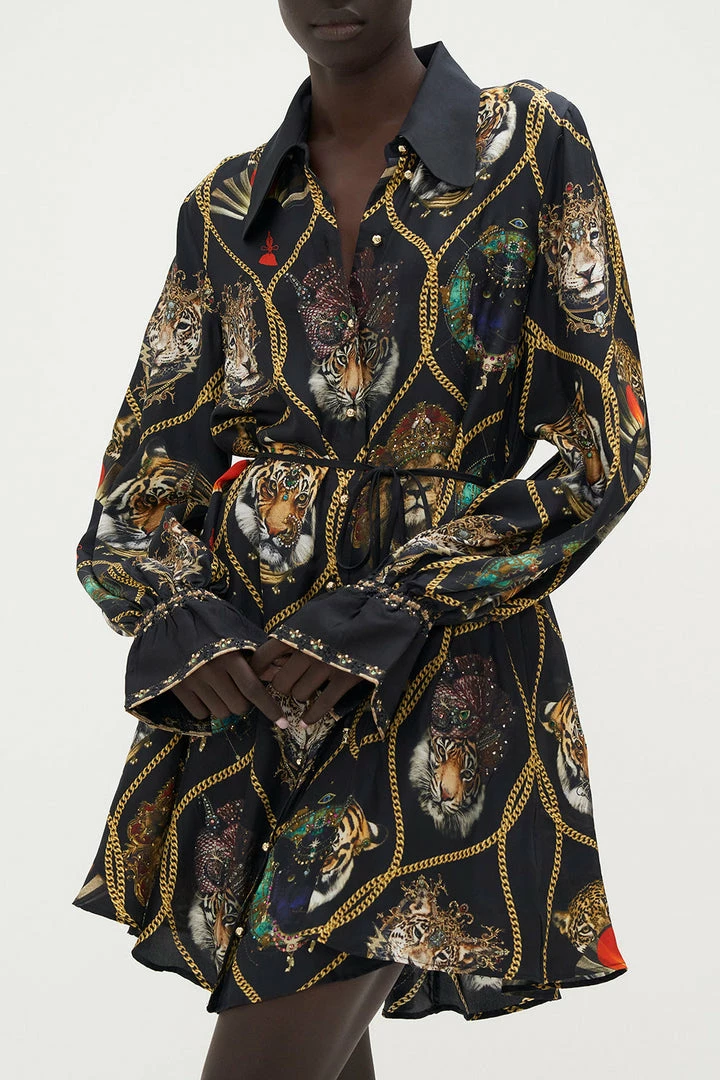 Oozing modern tailoring and striking feline eyes, the Jaggis Jewels Shift Shirt Dress paves the way for the powerful poker faces of tigers, lionesses and panthers as they sit amid gold baroque chain details. Finished with hand-embellished CAMILLA crystals, this luxury silk dress features full blouson sleeves that dance at the wrist, a structured collar, a flared mini hemline, contrast button fastening and a relaxed silhouette.