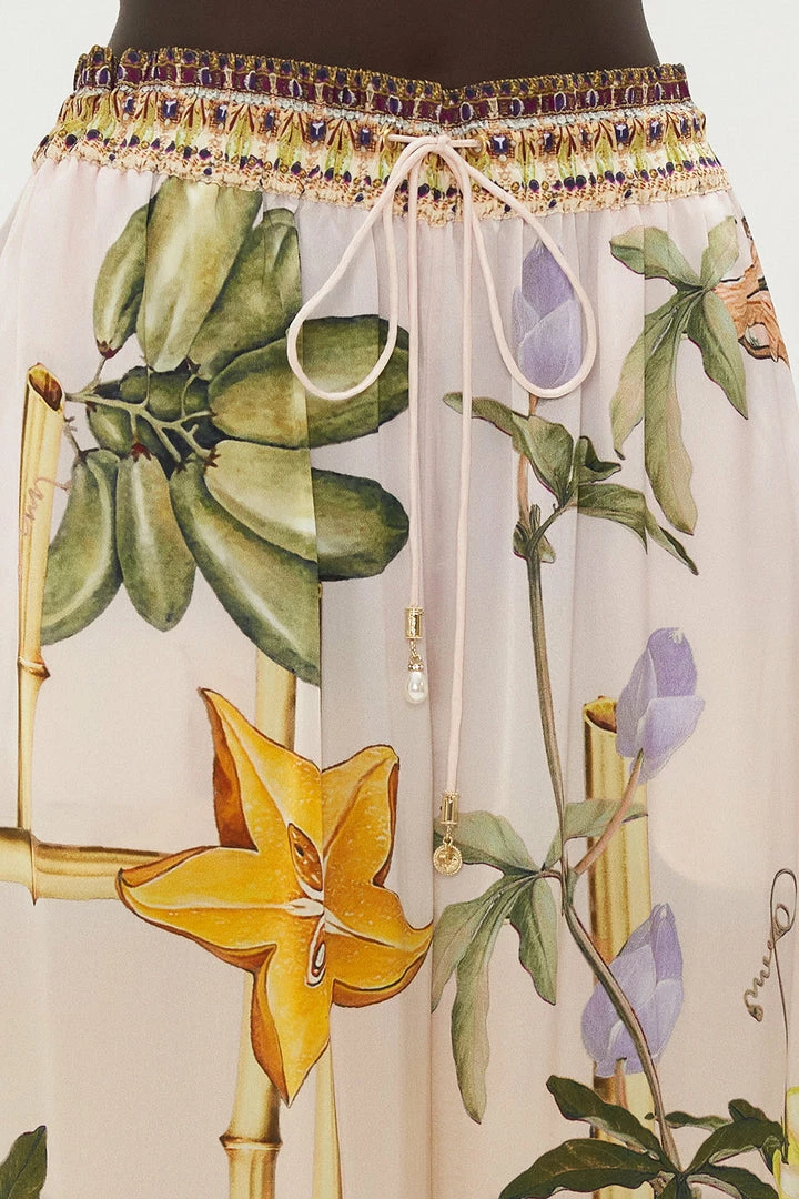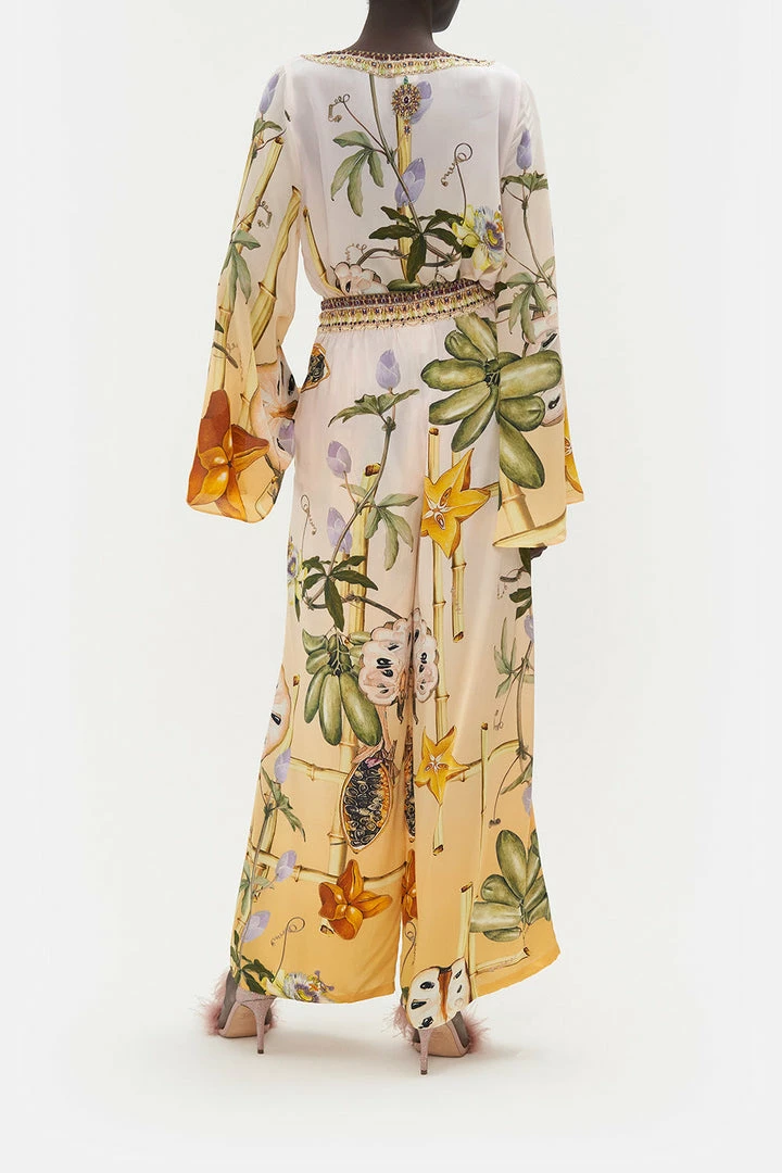 Curated for the lover of Pachamama, our Original Sin Straight Leg Pant is encased in a soft shade of sunset dipped in statement bamboo panelling, fruits of paradise and cascading vines that intertwine. Crafted from luxe silk, this statement pant features an elasticated drawstring waist to add cinching definition, an ankle-grazing wide leg that adds indescribable movement and hand-embellished crystals to glisten with every step.