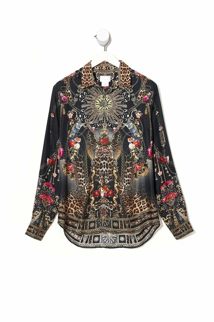 A majestically modern take on the architecture of the Middle Ages, the Gothic Goddess Collared Long Sleeve Shirt is a bold button up, fashioned from pure CAMILLA silk and printed with kaleidoscopic leopard and floral motifs. This statement long sleeve boasts cuffs and plackets hemming the sleeves as well as a contrasting leopard collar. Pair with the matching Gothic Goddess Elastic Waist Boardshort for a casual look or dress up with suit pants for more formal occasions.