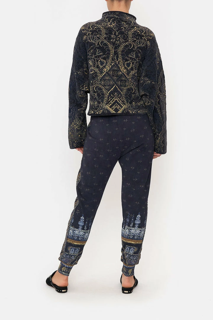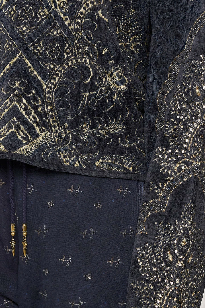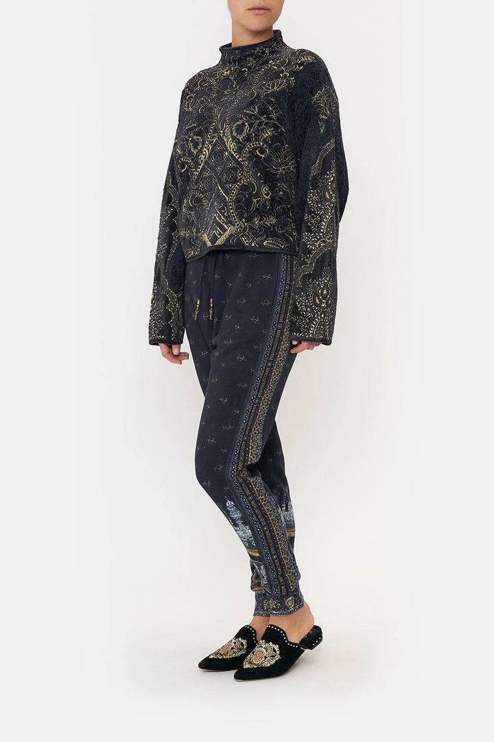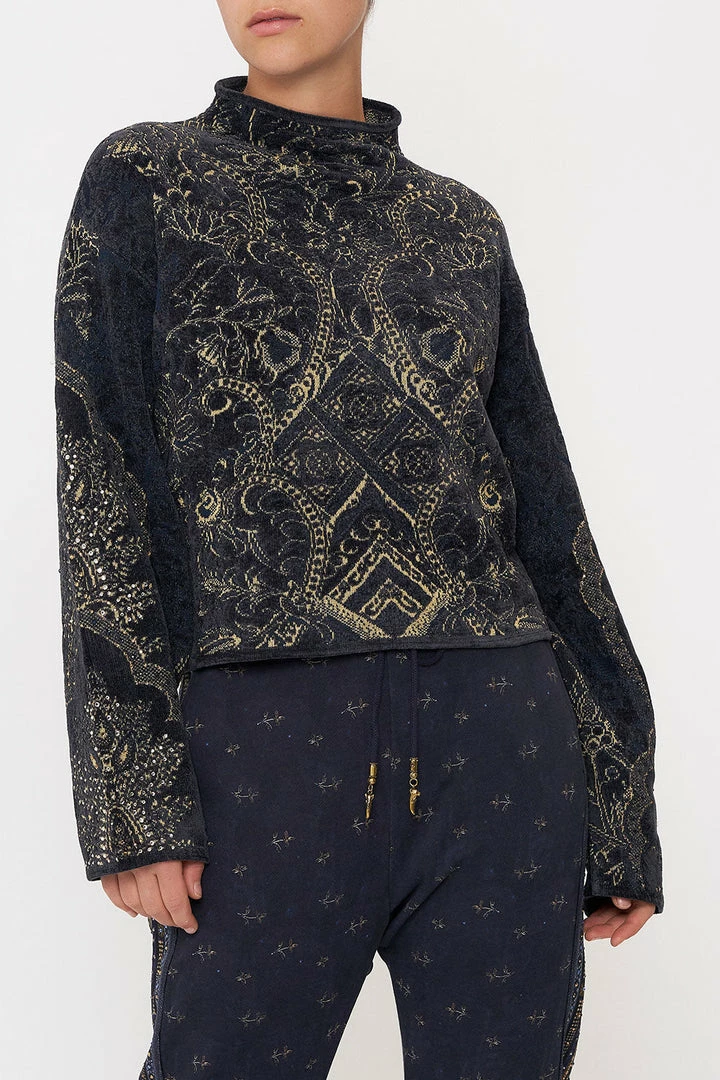 Elevating the transeasonal jumper with flickers of metallica, our Forever Family Cropped Funnel Neck Knit captures the gaze with midnight hues adorning golden cascades and classic baroque detailing. Adorning hand-embellished CAMILLA crystals, this luxury knit features a high funnel neckline, a statement raglan sleeve that dances at the wrist and a relaxed silhouette that meets contrast black trim.