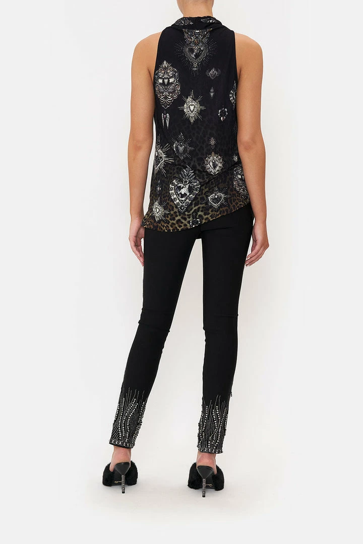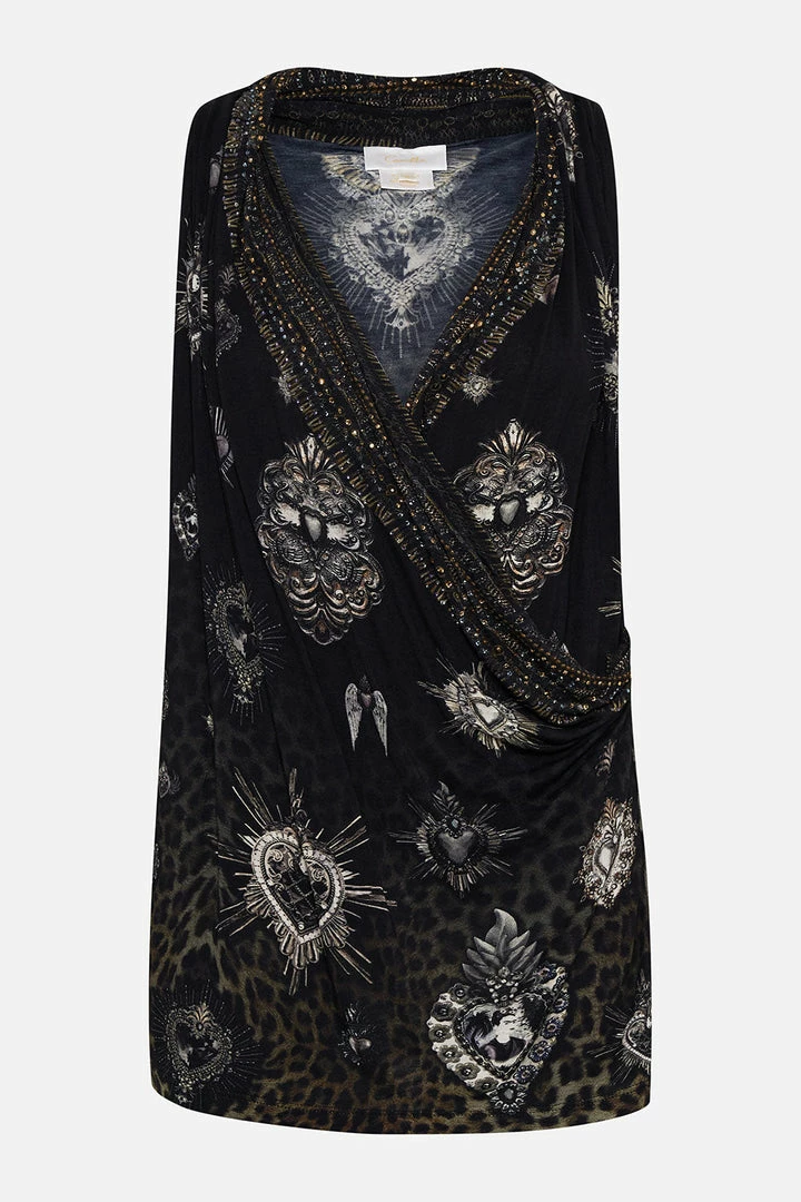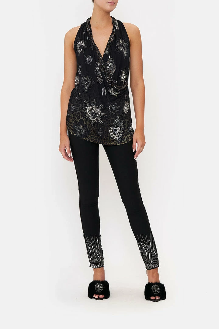 Wrapped in chrome hearts, the Order Of Disorder Cross Drape Top explores a deep shade of midnight adorning soft leopard print, metallic hearts and slated featherings. Adorning hand-embellished CAMILLA crystals, this luxury halter top features a deep v neckline, a relaxed silhouette, a drop waist to elongate the torso and a wrap-style cut.