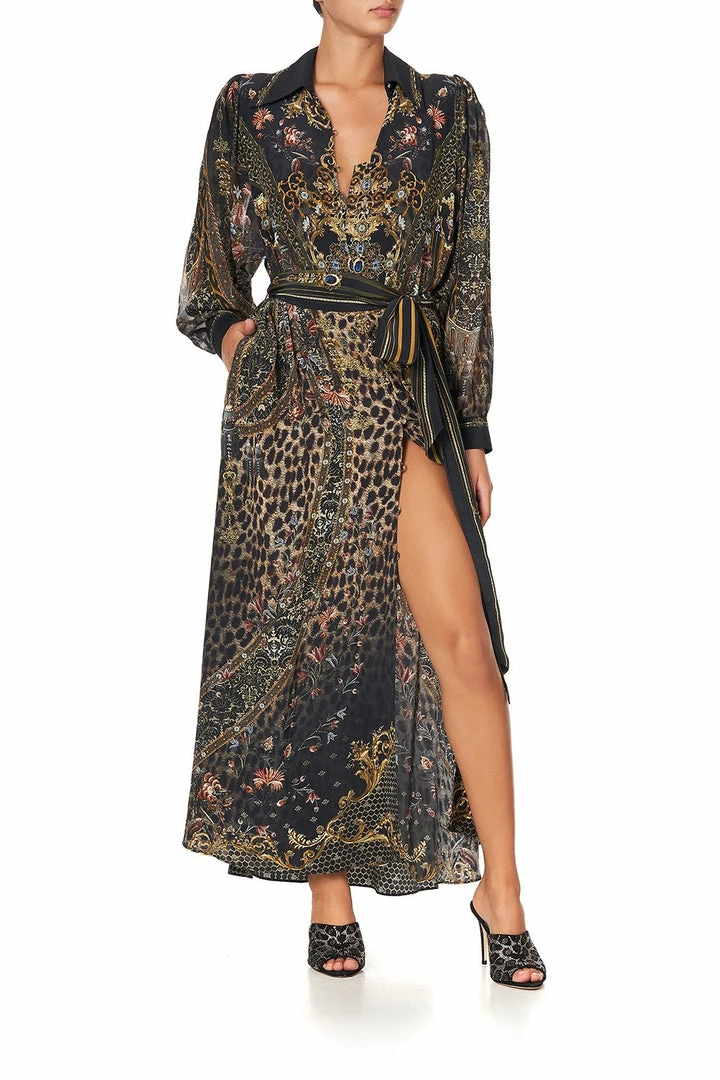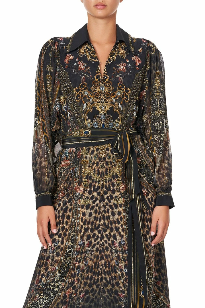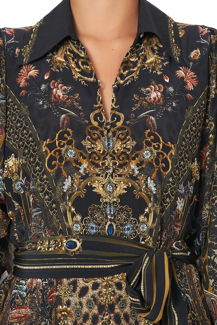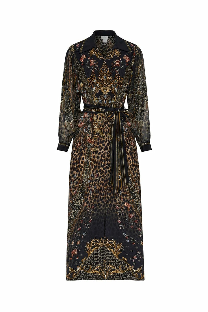 Abolish the ordinary with the Abingdon Palace Curved Collar Shirt Dress, inspired by the aesthetic of Biba’s interior décor in a black print with gilded accents. Its feminine profile is tailored with blouson sleeves and buttoned cuffs before it tumbles from the belted waist to an elegant maxi length. A gorgeous choice for evening wear with the versatility to wear alone or worn open as a decadent layer for a vintage inspired aesthetic.
