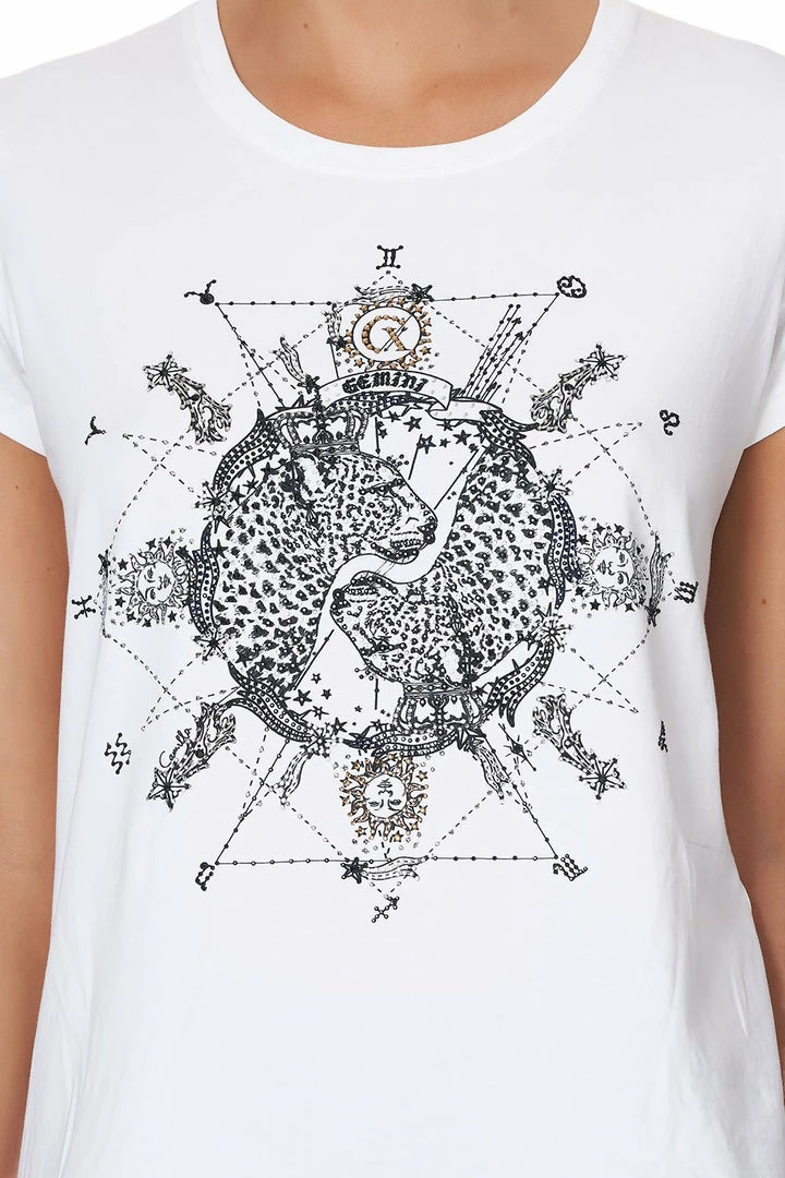 A statement tee for air angels born between May 21st to June 21st, the Gemini Curved Hem Tee is an astrology wonder. Crafted in a soft 100% cotton in a fitted shape, this star sign tee features a hand drawn Gemini placement print and ribbed neckline and is finished with hand applied crystal embellishments. An essential tee for the versatile, youthful, curious and fun social butterflies of the zodiac.
