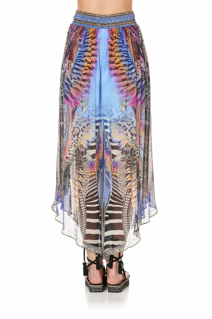 Rich with texture, the Love On The Wing Curved Hem Pant crafts warm crinkled silk into a relaxed bohemian style, elevated with hand-placed crystal embellishment. This much-loved CAMILLA silhouette is adorned with a colourful animal print honouring the planet’s most majestic beings. This luxe loungewear piece is finished with an elasticated waistband, tie tassels and gentle curved hem. Pair back with the Love On The Wings T-back Shoestring top for easy summer styling.