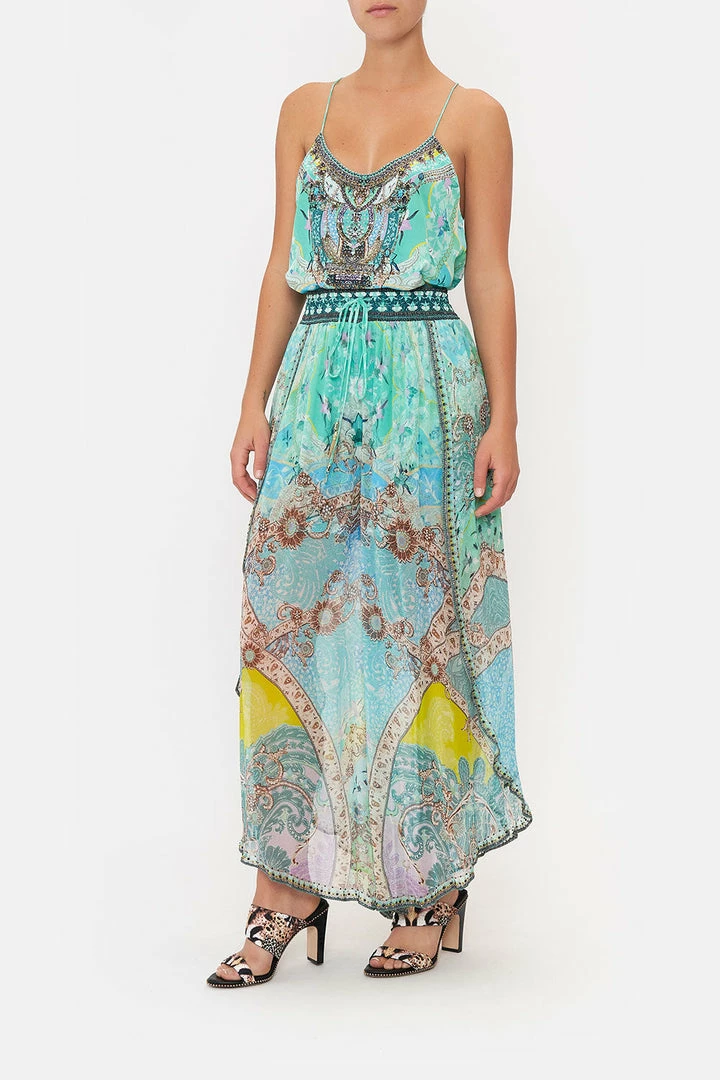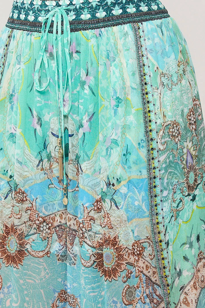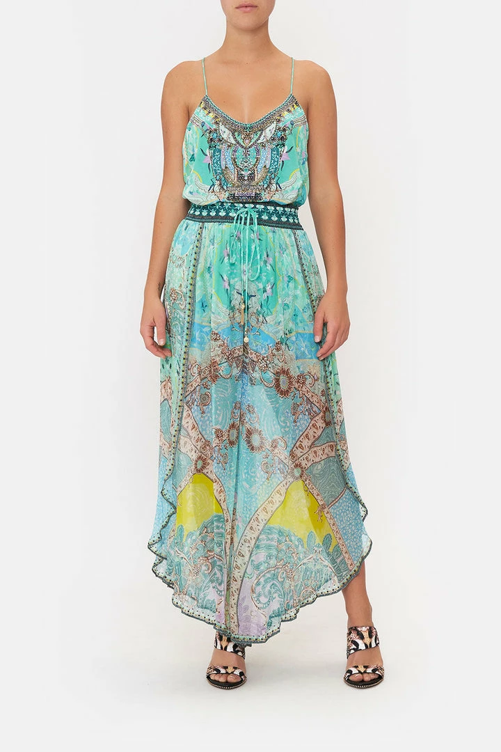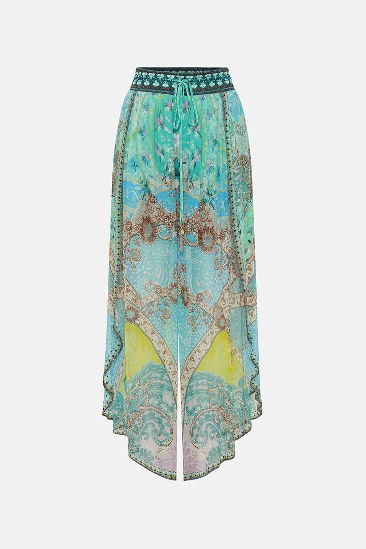 Transporting us to the meadows of India with a single step, the Turn Back Time Curved Hem Pant graces the eye with turquoise paisley indulgence, muted gold floral detailing and intricate panels of tantalising teal. Complete with hand-embellished CAMILLA crystals, these luxury silk pants feature an elasticated high-rise waist with drawstring accents, gold hardware detailing, a softly shaped hemline that dips into a soft billow and an effortlessly relaxed silhouette.