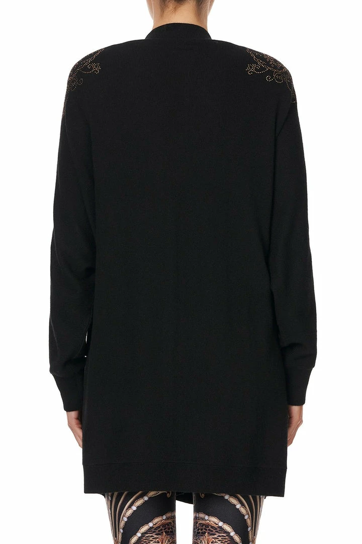 An opulent piece to ensure your warmth through out winter, the Studio 54 Dolman Shoulder Pad Cardigan is a heavenly masterpiece of CAMILLA knitwear. Crafted in a soft black cashmere, this easy fit cardigan features shoulder pad detail, dolman shape sleeve and heavenly gold beaded embroidery at shoulder. A simple layering piece to pair back with dark colour palette current season pieces.