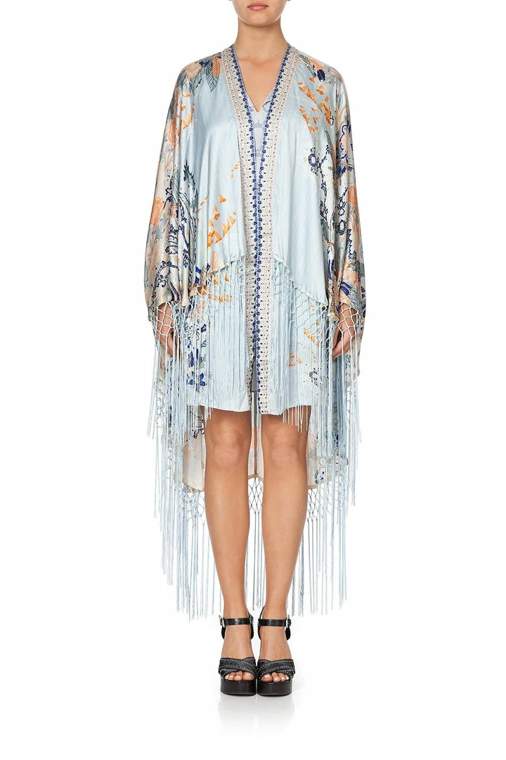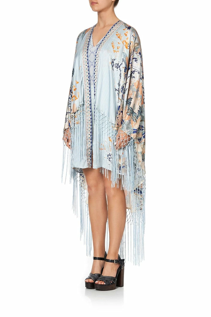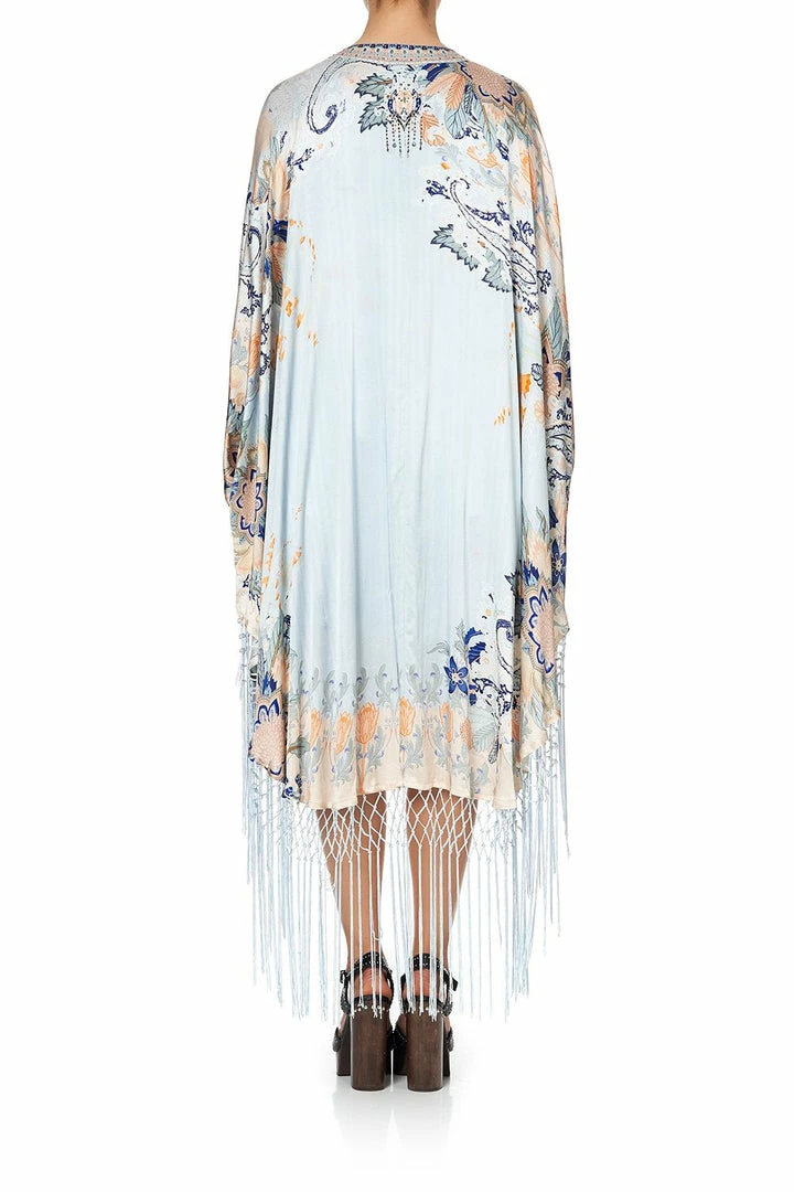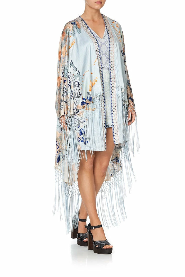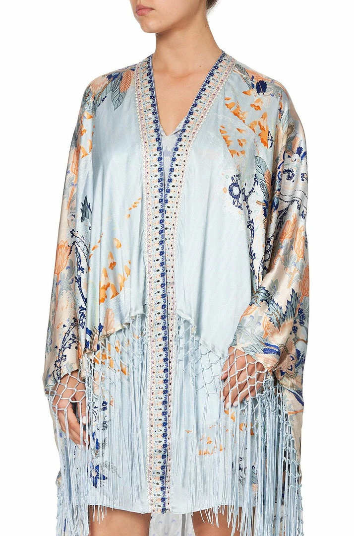 Chic contemporary layering kimono, the Fraser Fantasia Draped High-Low Layer is crafted in dreamy pastel blue hues, with pops of tangerine flora in an ode to the free spirited memories of summer holidays exploring Fraser Island. Featuring double layered pure silk satin, contrast reptilian neckline, dramatic tassel fringing on a crystal embellished high low hem, this silk kimono is a feminine work of art.