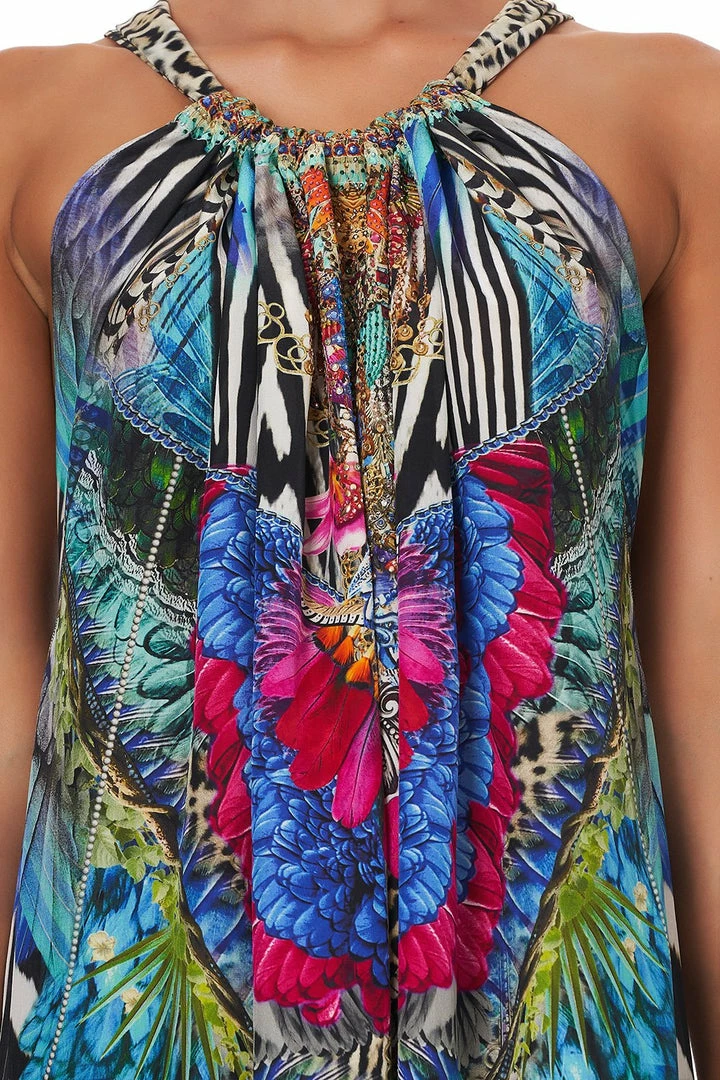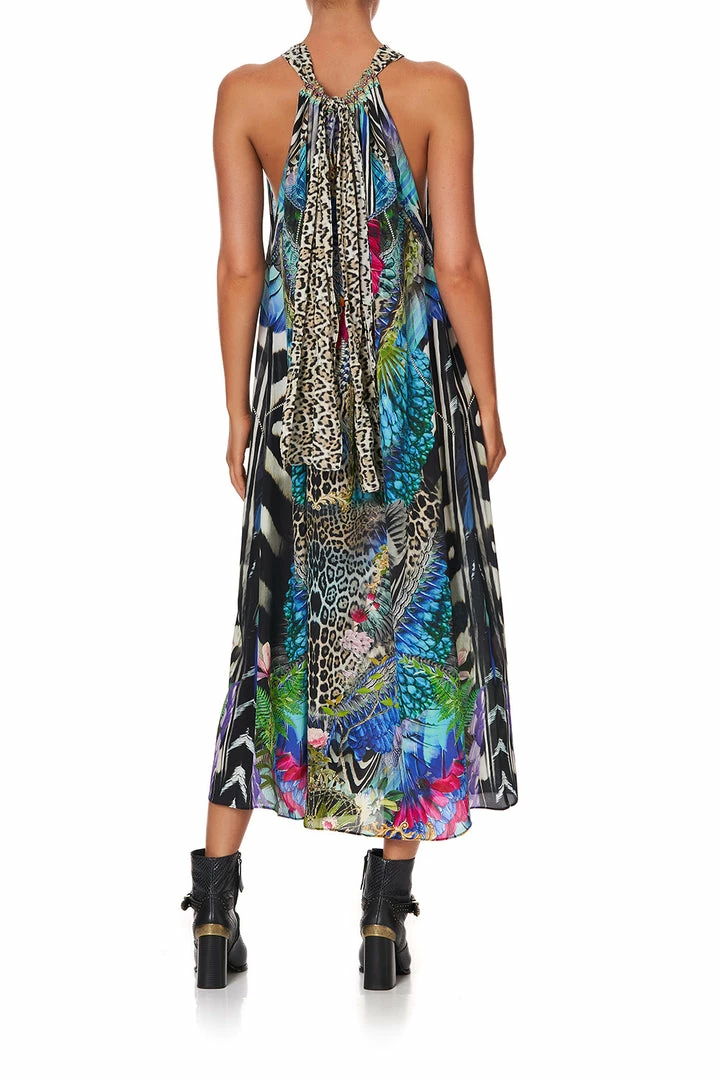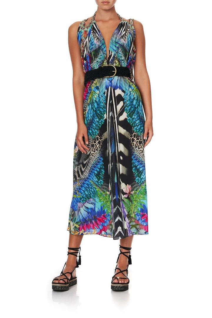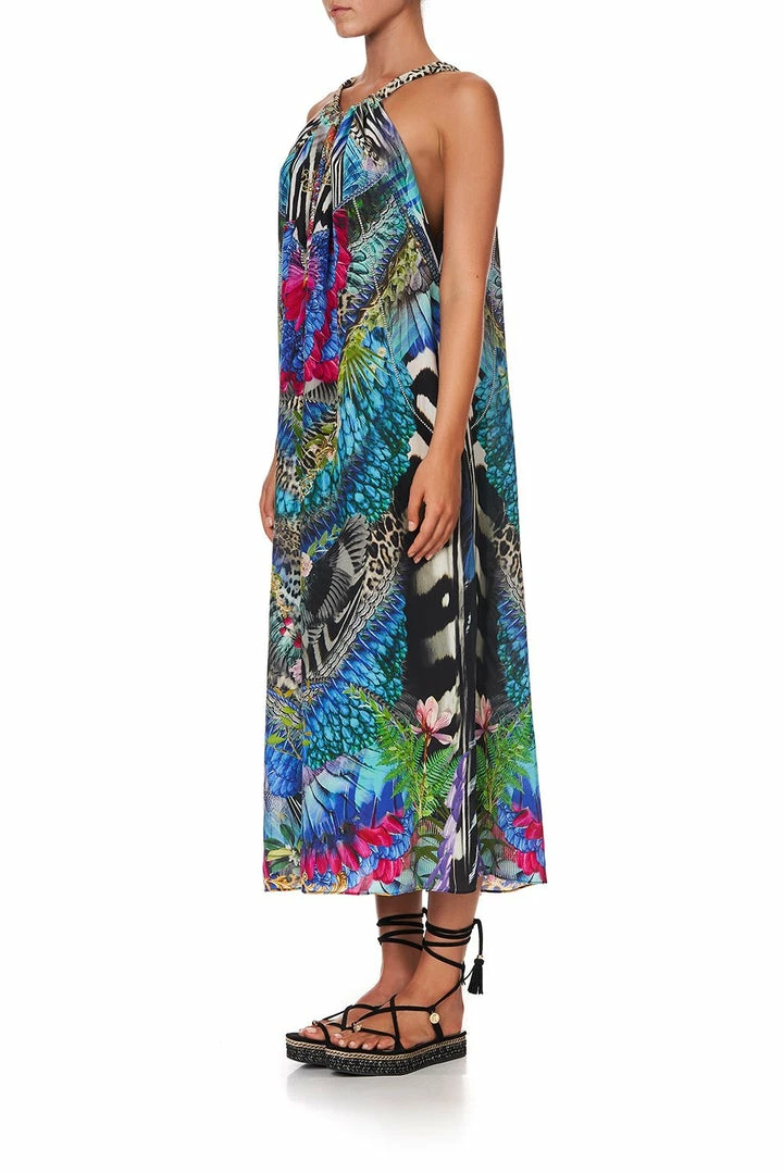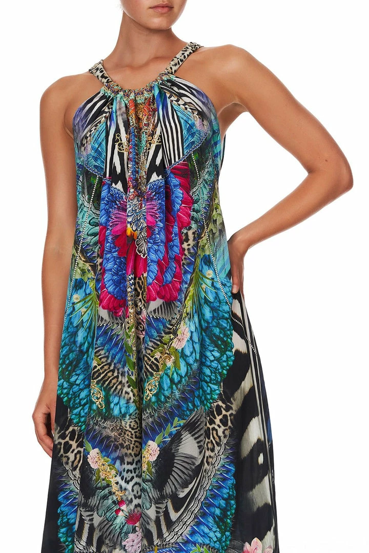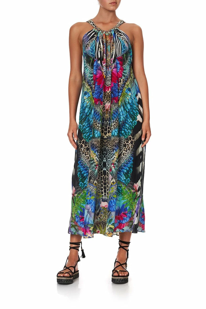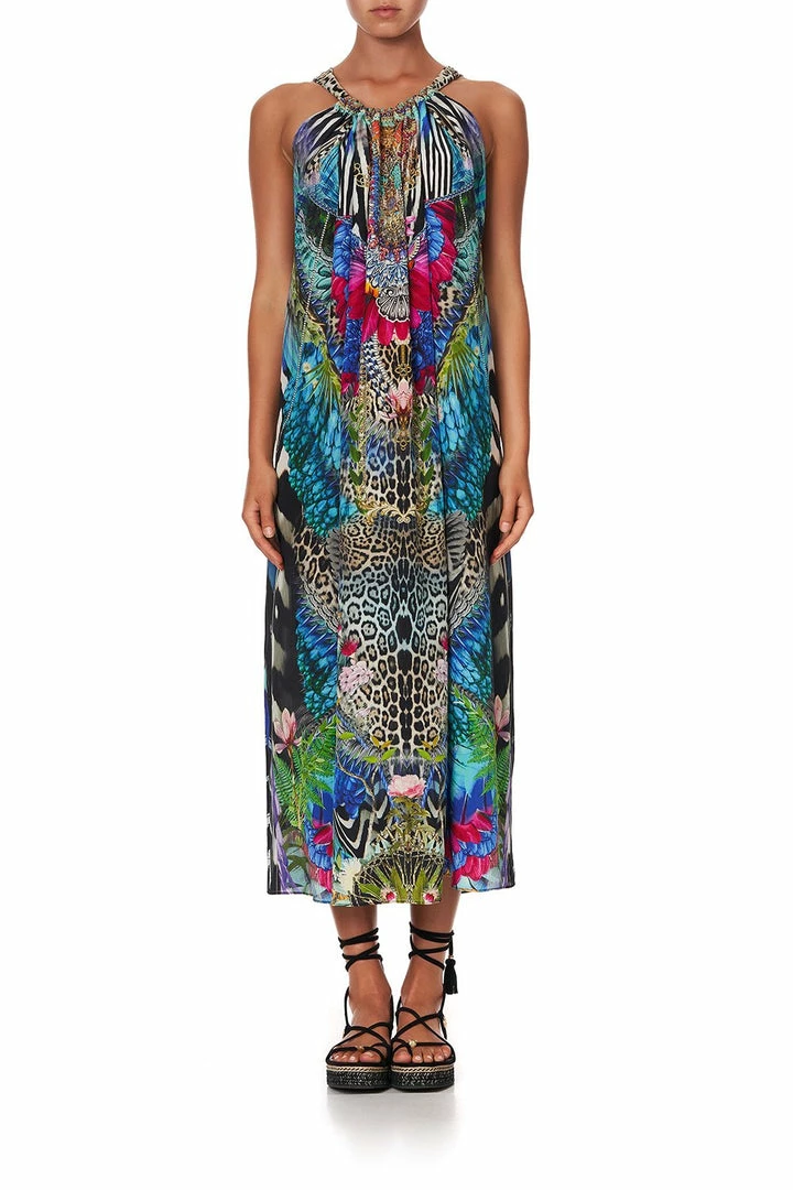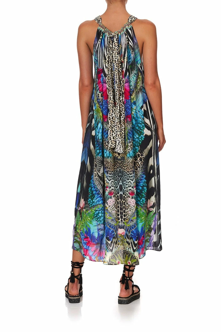A regal canvas of pure CAMILLA silk is crafted into the boho silhouette of the Cafe Nairobi Drawstring Dress. Rich with neon nods to the splendour of the animal kingdom, this loose-fitting full-length style is cut with a keyhole neckline at the back. This crystal embellished dress is designed with an adjustable strap that allows for a plethora of styling options; with one-shoulder in a Grecia maxi style to a playful backless halter. Visit the CAMILLA Style Guide to view the many ways to reimagine this celebrated CAMILLA classic.