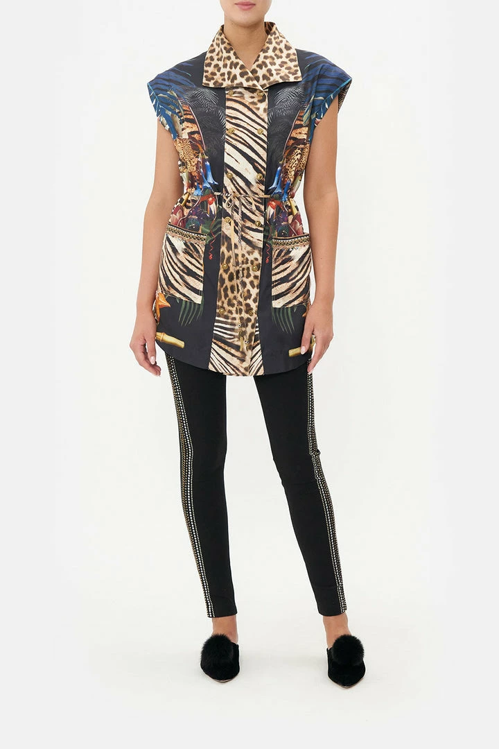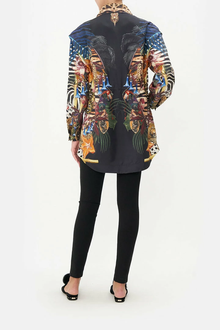 Leaving subtly behind and embracing all that is wild and untamed, our Natural Instinct Drawstring Panelled Jacket calls to a soft sunset scene enveloped by slated bluebells, cheetah print, ferns of paradise and striking big cat portraits. Adorning hand-embellished CAMILLA crystals, this luxury silk jacket features an oversized shoulder, a drawstring waist to cinch and shape, golden hardware and statement collar that falls into a relaxed silhouette.