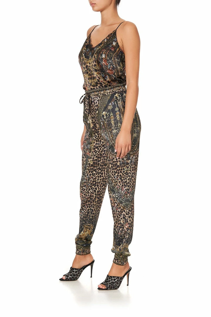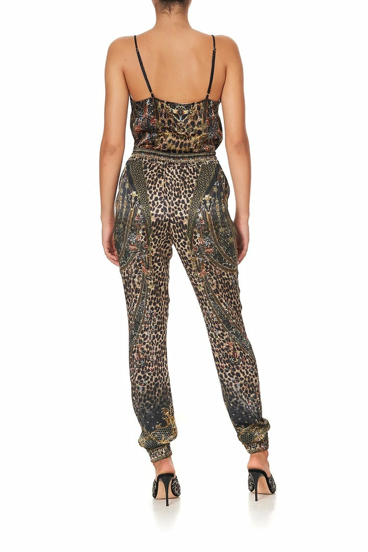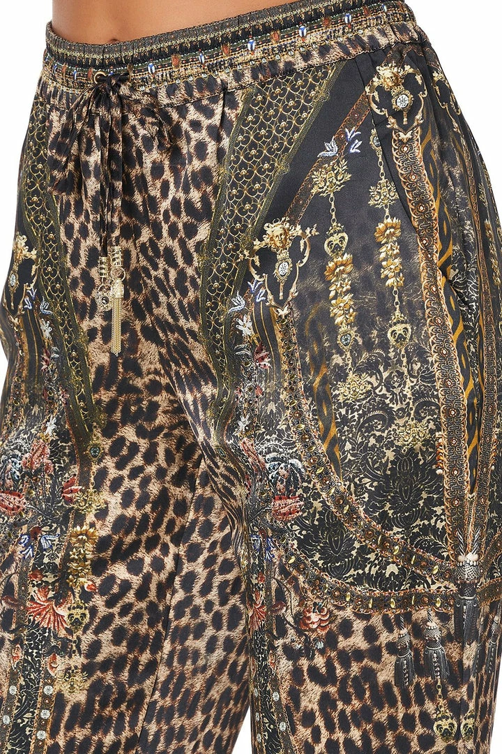 Fiercely rebellious yet delicately feminine, the Abingdon Palace Drawstring Pant with Ribbing sought inspiration from the theatre of Biba Boutiques’ design, with gilded latticework insignia woven on a silk cloth of leopard spots. These statement pants deserve to be showcased at either casual gatherings or as evening wear, featuring a comfortable elastic waist with draw cord ties, convenient pockets and a boarded trouser cuff. Pair with your favourite heels, a simple tee and a leather jacket for an effortless approach to day-to-night wear.