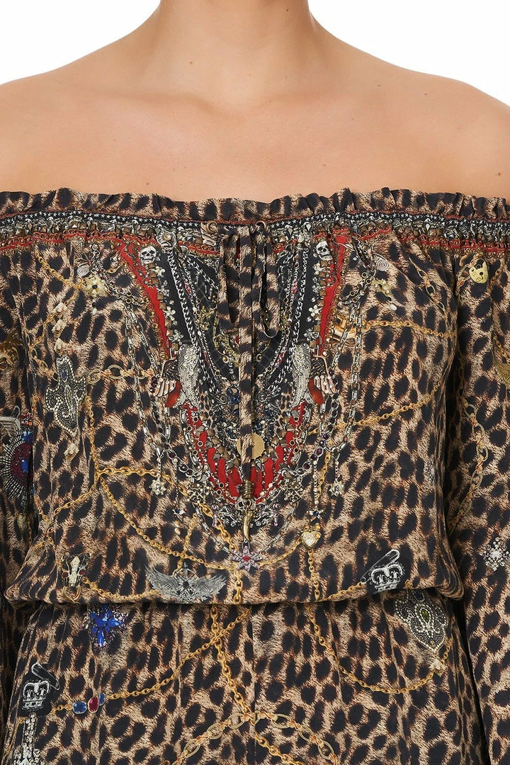 Styled in a fun and flirty silhouette, the Poetic Anarchy Drop Shoulder Frill Playsuit is designed with mischief in mind. Inspired by the children of the anti-establishment, all-over leopard print is punctuated with punk inspired chain, skull and safety pin motifs. Rock and roll style studs highlight the eye-catching off-shoulder neckline whilst frilled cuffs add a touch of romance to the rebellion. This pure silk playsuit is crafted with an elasticated waist to offer a perfect fit and feminine form. Fly the flag for punk and shine bright your next summer soiree.